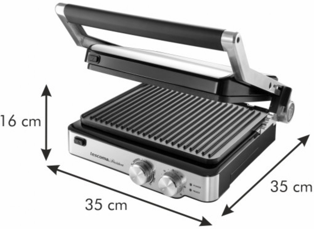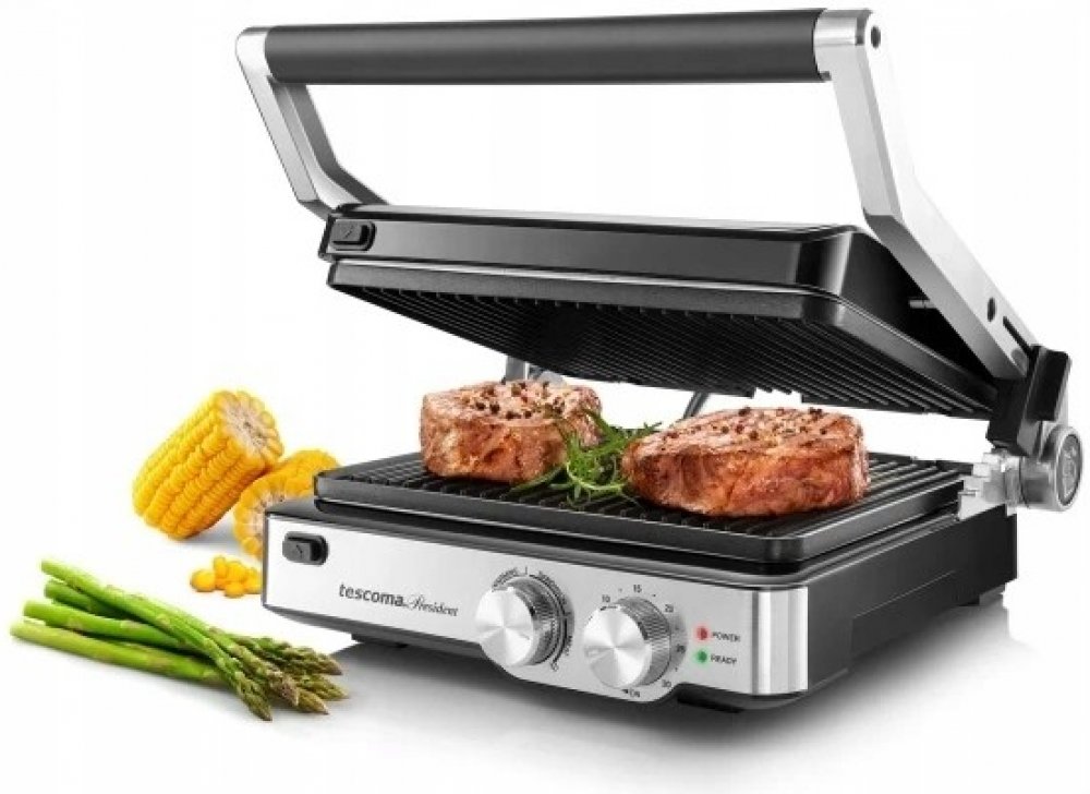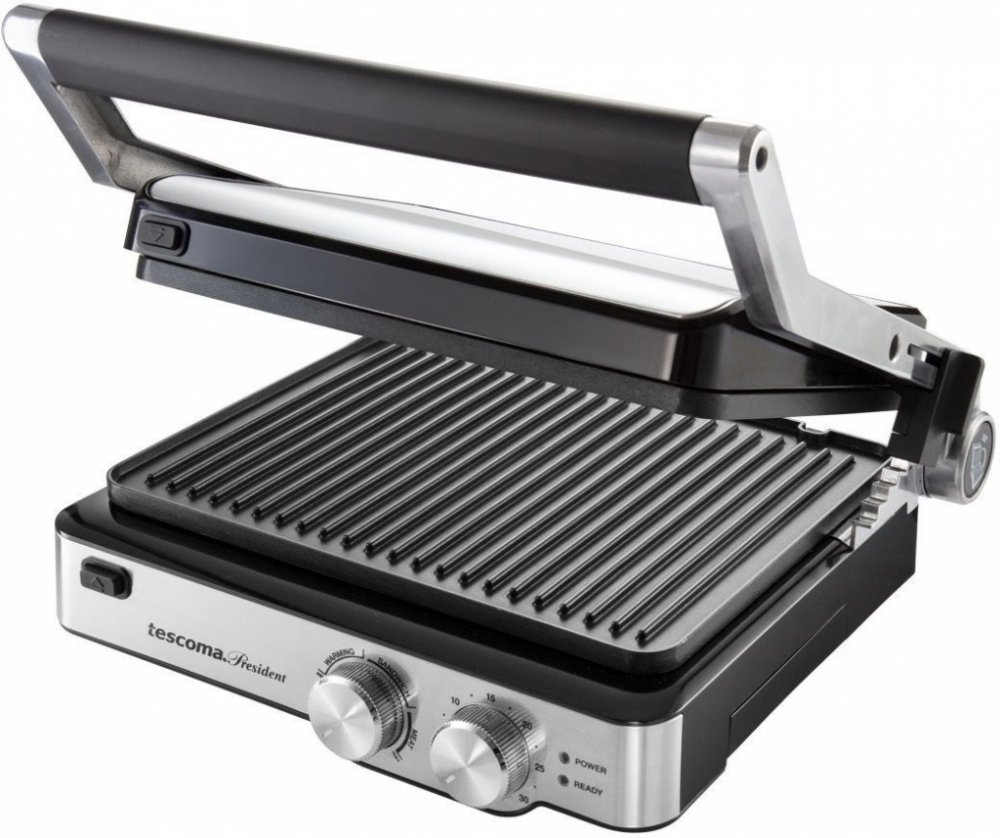 Sendvič, toast, panini? Nebo raději vysoký steak, grilovaná ryba, mořské plody či zelenina? Kontaktní gril PRESIDENT je rozžhavený během chvilky a připraven ugrilovat cokoli máte rádi a kdekoli v dosahu elektrického proudu. Gril PRESIDENT umí nejen současně opékat z obou stran, ale zvládne i klasické „barbecue“ grilování - stačí jej zcela rozevřít a využít dvojnásobnou grilovací plochu. Pro snadné použití je gril opatřen minutkou, doba grilování je nastavitelná v rozmezí od 5 do 30 minut, po uplynutí nastaveného času se ohřev automaticky zastaví. Grilovací desky s antiadhezním povlakem jsou odnímatelné a nechybí ani zásobník na zachycení výpeku. Při kontaktním grilování je horní deska nastavitelná do 5 poloh, v grilu PRESIDENT tak snadno připravíte i extra vysoké steaky. Díky integrovaným topným spirálám nedochází během ohřevu ke ztrátám tepla, grilování je intenzivní a plynulé, gril reaguje rychle na změnu nastavení teploty. Kontaktní gril PRESIDENT je vyroben z prvotřídní nerezavějící oceli a odolného plastu, grilovací desky jsou opatřeny kvalitním nepřilnavým povlakem. Odnímatelné desky můžete bez obav umýt pod tekoucí vodou, ostatní části grilu čistěte vlhkou utěrkou. Nedoporučujeme používat ostré předměty, náčiní, agresivní chemické látky, ocelové kartáče apod.