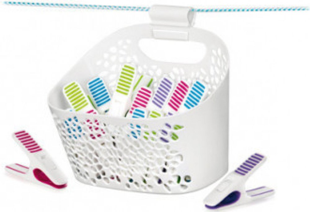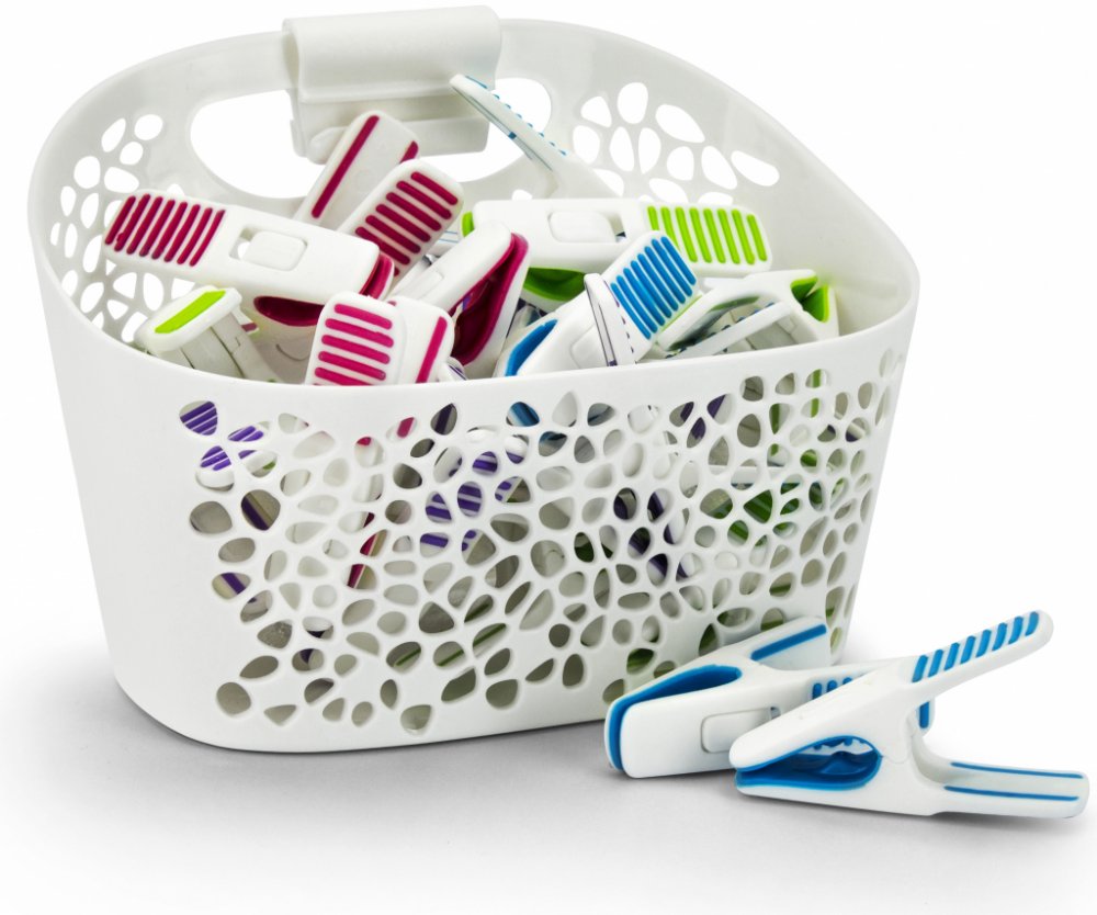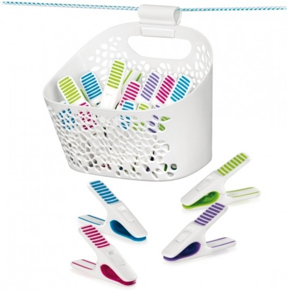 Odolné kolíčky na prádlo s košíkem pro zavěšení na prádelní šňůru. Kolíčky CLEAN KIT drží prádlo na šňůře pevně přichycené, díky speciálnímu měkčenému povrchu však nezanechávají na prádle otisky. Kolíčky jsou celoplastové, neobsahují kovovou pružinku a jsou proto odolné i při používání ve venkovním prostředí, nerezaví a nezachází. Rozměry kolíčku: délka 7 cm, výška 4 cm.