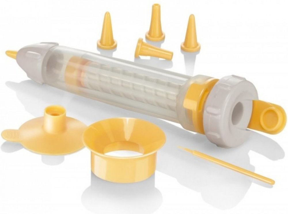 Cukrářská zdobicí tužka DELÍCIA pro dekorování pokrmů je dodávána s 5 tryskami pro různé dekorovací techniky. V sadě naleznete i praktický stojánkem pro snadné plnění a odkládání tužky během zdobení i univerzální čistítko. Vyrobeno z prvotřídního silikonu a odolného plastu. Vhodné do myčky nádobí.