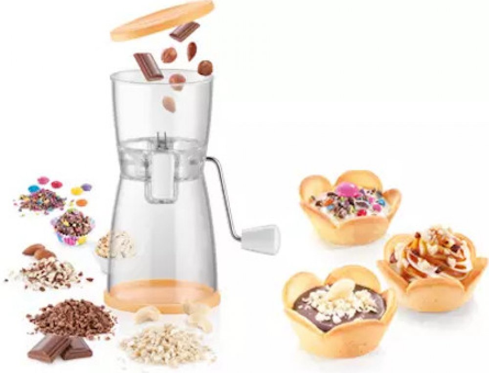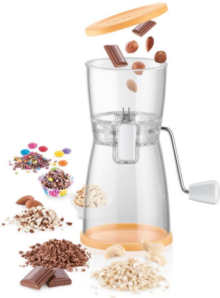 Praktický ruční mlýnek pro rychlou přípravu oříškových, čokoládových a sušenkových posypů na moučníky, zmrzliny a dezerty.