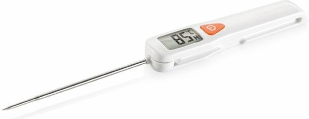 Digitální sklápěcí teploměr ACCURA značky Tescoma představuje výtečného pomocníka pro měření teploty uvnitř pokrmů a nápojů během vašeho vaření. Měřící nerezová sonda je sklápěcí, navíc je odolná vůči páře a vlhkosti. Funkce HOLD umožňuje přidržet změřenou teplotu tak, abyste si ji mohli komfortně přečíst z LCD displeje, který ukazuje velké a dobře čitelné číslice. Je vyrobený z prvotřídní nerezavějící oceli a odolného plastu. Teploměr ACCURA je dodáván s baterií. Klíčové vlastnosti sklápěcího teploměru ACCURAJe ideální při přípravě polev, rozvarů, omáček a nápojůTeploměr ACCURA má LCD displej s číslicemiSklápěcí rozsah je od -50 do 300 °CMěří ve stupních Celsia nebo FahrenheitaJe výborně skladnýTeploměr je odolný vlhkosti nebo páře