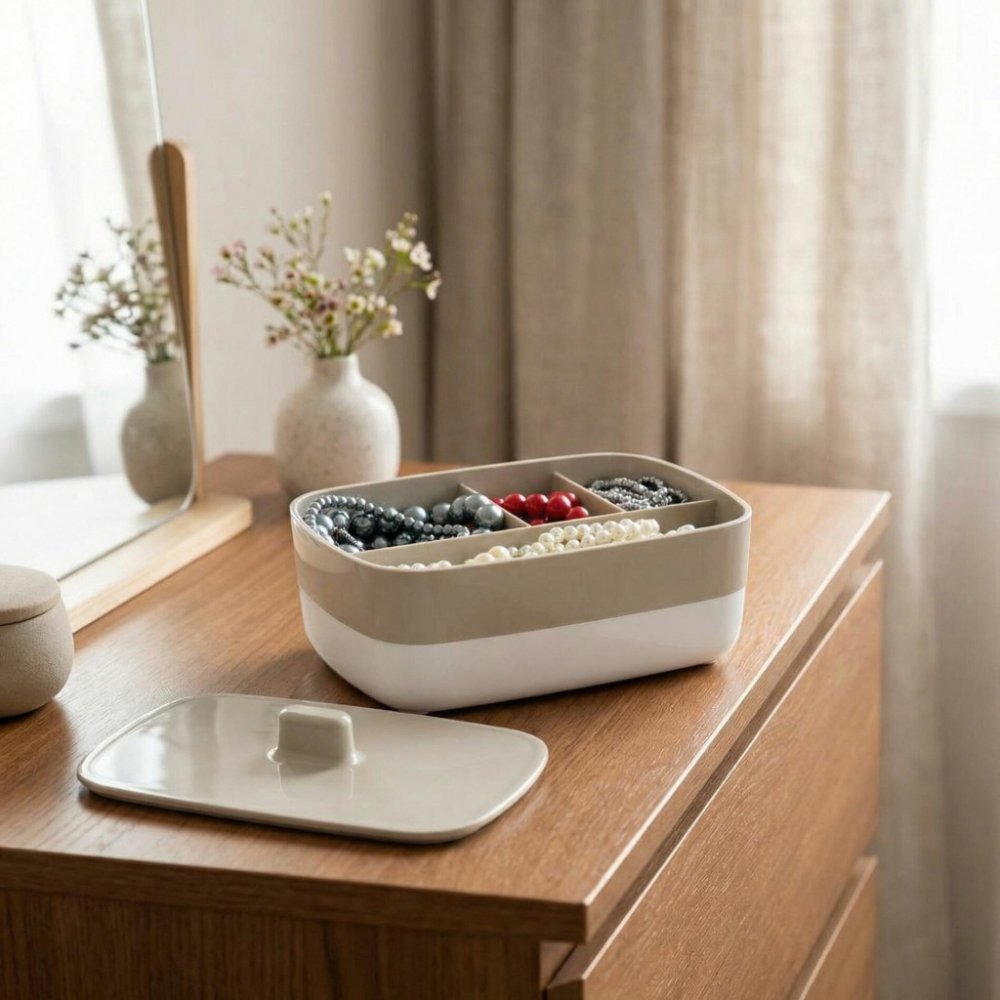 \nVynikající pro přehledné odkládání šperků a bižuterie. S šesti různě velkými oddíly a víčkem chránícím šperky před znečištěním. Vyrobeno z odolného plastu s protiskluzovou úpravou dna. 3 roky záruka