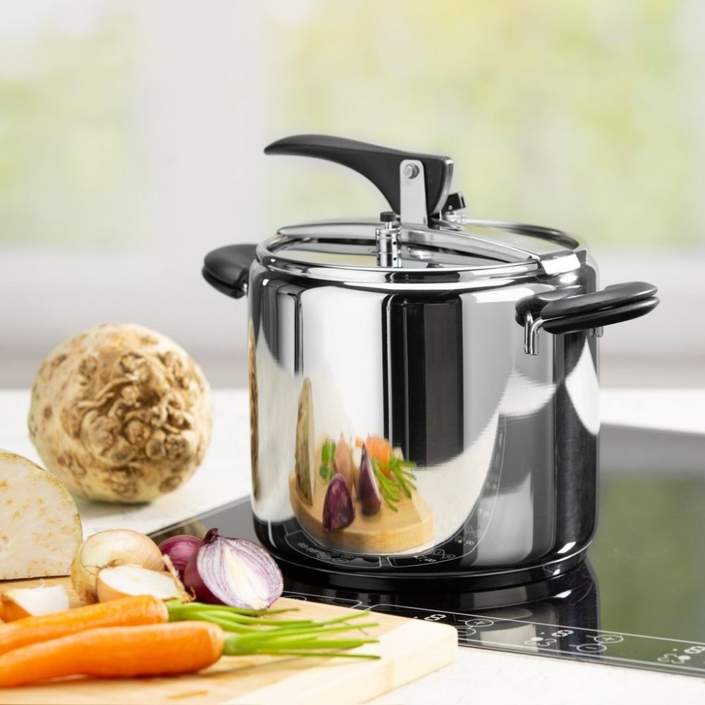 TESCOMA tlakový hrnec MAGNUM 7.0 l - Tlakový hrnec MAGNUM je vyroben z vysoce kvalitní nerezavějící oceli. Je vybaven masivními úchyty, které nepálí a extra silným sendvičovým dnem. Vhodný pro všechny typy sporáků – plynové, elektrické, sklokeramické a indukční. Snadné a bezpečné použití, vysoká spolehlivost. 5 roků záruka.