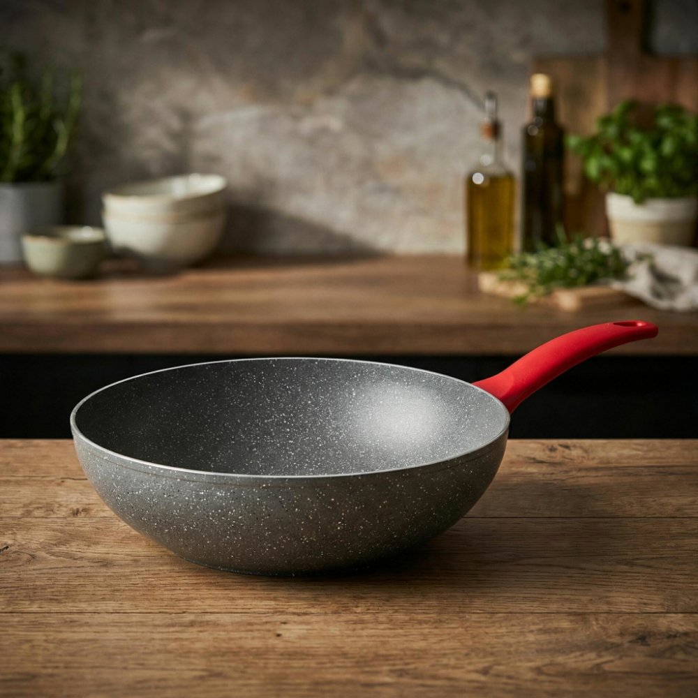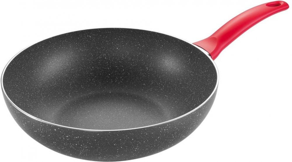 Praktický WOK je vybavený prvotřídním antihezním povlakem s charakterem leštěného přírodního kamene, na kterém se vám potraviny nepřilepí ani nepřipálí. Pokrmy se v tomto WOKU opékají rovnoměrně. Bezpečnost výrobku je zaručená masivní protiskluzovou rukojeťí. Masivní protiskluzová rukojeť zajišťuje bezpečnou a pohodlnou manipulaci.