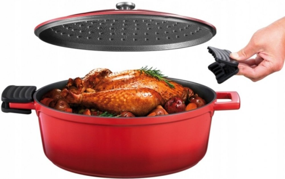 Atraktivní kuchyňské nádobí Bordeaux značky Tescoma na sporák i do trouby. Je celokovové a kromě odnímatelných silikonových úchytů neobsahuje žádné plastové části. Můžete je proto používat nejenom na všech typech sporáků včetně indukčních, ale i ve všech typech pečicích trub.Pružné silikonové úchyty pro bezpečné přenášení horkého nádobí lze snadno nasadit i sejmout. Nádoby i poklice jsou opatřeny prvotřídním antiadhezním povlakem, který zabraňuje připalování a přispívá ke snadnému čištění. Výstupky na spodní straně poklice a poklopu umožňují rovnoměrné stékání odpařené tekutiny zpět do pokrmu. Pokrmy připravované v nádobí BORDEAUX jsou díky unikátnímu řešení poklic rovnoměrně uvařené i propečené, nejsou vysušené a zůstávají šťavnaté. Materiál: kvalitní kov, nerezové indukční dno, úchyty z žáruvzdorného silikonu. Prodloužená záruka 3 roky
