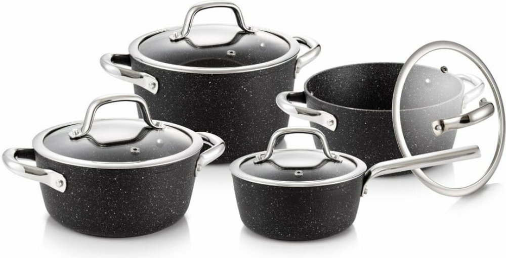 Nádobí President je vyrobené z materiálu s charakterem přírodního kamene s nepřilnavým povrchem a odolností i vůči kovovému kuchyňskému náčiní . Díky unikátnímu zvrásněnému povrchu se navíc pokrmy opékají rovnoměrně a s minimem tuků . Další předností je také nenáročná údržba . Detailní obsah sady: • hrnec s poklicí: průměr 20 cm, objem 3 l, • kastrol s poklicí: průměr 18 cm, objem 1,8 l, • kastrol...