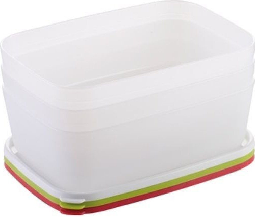 Plastové dózy pro uchovávání potravin. Vyrobeno z plastu určeného pro zdravotnictví a farmacii, neovlivňuje kvalitu pokrmu. Vhodné i pro uložení potravin v mrazničce nebo chladničce. Dózy jsou elastické a stohovatelné na sebe, dobře těsní. Dostupné ve třech velikostech: objem 0,5 l, 1 l nebo 1,5 l. Každá velikost je balena po 3 ks.