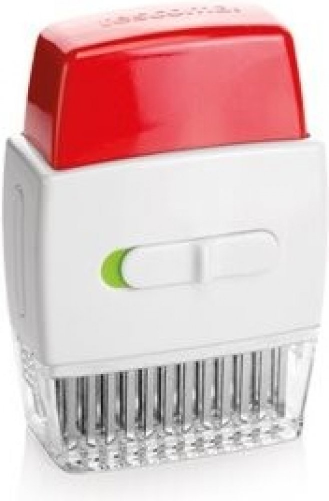 tenderizer pro přípravu šťavnatých steaků a zvláčňování všech druhů červeného masa, opatřeno zámkem pro bezpečné skladování, vyrobeno z nerezavějící oceli a odolného plastu, lze snadno rozložit a vyčistit, vhodný do myčky