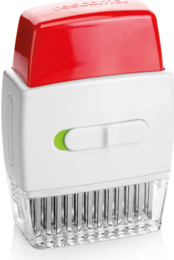 Připravte si dokonale propečené, šťavnaté a křehké steaky z kteréhokoliv druhu červeného masa. V čem je tenderizer na maso HANDY výjimečný? S tenderizer na maso HANDY snadno prokrojíte plátky hovězího, telecího, vepřového i jehněčího masa. Maso upravené tenderizerem HANDY nemusíte naklepávat, steaky budou po upečení dokonale křehké a šťavnaté. Díky originální promyšlené konstrukci lze tenderizer HANDY po použití snadno rozložit a dokonale vyčistit, je vhodný do myčky nádobí. Jaké má tenderizer na maso HANDY další výhody? ostré čepele jsou vyrobeny z prvotřídní nerezavějící oceli pro bezpečné skladování je tenderizer opatřen zámkem Materiál: Prvotřídní nerezavějící ocel, odolný plast. Údržba: Lze snadno rozložit, vhodné do myčky. Délka (cm): 22.000/8Šířka (cm): 13.000/4Výška (cm): 4.100/11.5Váha včetně obalu (kg): 0.200Délka záruky (v letech): 3Mytí v myčce: ANOTyp: tenderizerZařazení: pomůcky do kuchyněMateriál: plast, nerez ocelProduktová linie: HANDY Výborně se hodí k přípravě šťavnatých steaků a ke zkřehčení všech druhů červeného masa. Tenderizér lze snadno rozebrat a dokonale vyčistit, lze jej mýt v myčce nádobí. S uzamykacím mechanismem pro bezpečné skladování, vyrobený z prvotřídní nerezavějící oceli a odolného plastu. Typ: TenderizérDřezy: 1Kategorie: Kuchyňské náčiníMateriál: Plast, nerezová ocelProduktová řada: HANDYDélka (cm): 22.000/8Výška (cm): 4.100/11.5Šířka (cm): 13.000/4Hmotnost včetně obalu (kg): 0.200 Mlýnek na maso HANDY Materiál: Plast, nerezová ocel Vhodné do myčky: Ano Technická specifikaceID produktu: 53012Barva: bílá, červenáDélka: 11,5 cmCelková šířka: 8,0 cmHmotnost: 0,20 kgDélka čepele: 2,5 cmPočet čepelí: 60 ks.Symbol výrobce: 643890.00Série: tescoma handyMateriál: plast--------------------------------------------Možnost použití: Možnost mytí v myčce nádobí,