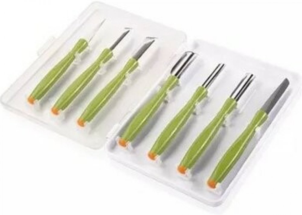 Univerzální souprava vynikající pro dekorování zeleniny a ovoce – mrkve, bílé ředkve a ředkviček, okurek, cuket, pórku, dýně, jablek, hrušek, manga, melounů apod. Souprava obsahuje 6 speciálních vykrajovacích nožů, keramický brousek a krabičku pro jejich bezpečné uložení. Vyrobeno z prvotřídní nerezavějící oceli a odolného plastu. Nože jsou vhodné do myčky, brousek v myčce nemyjte. Návod k použit...