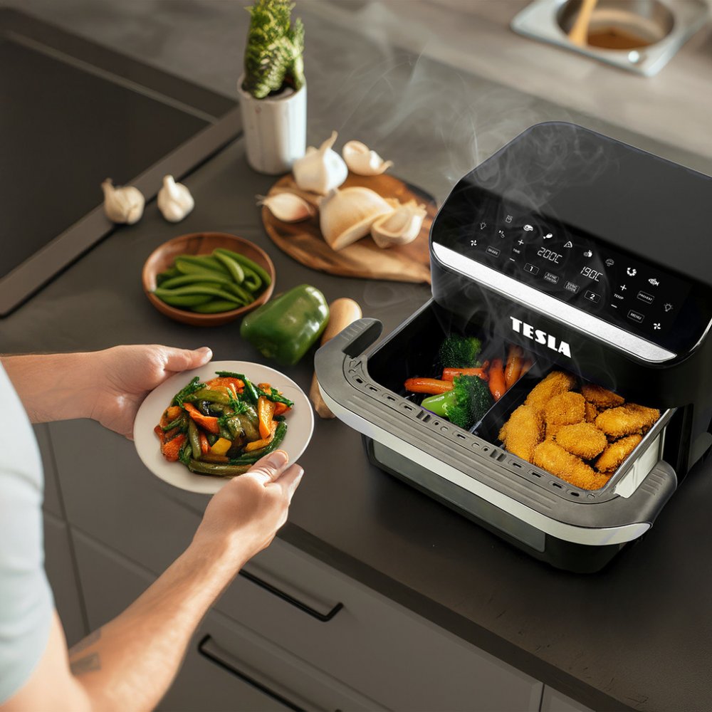 Máte rádi smažená jídla, ale bojíte se, že jsou nezdravá? S horkovzdušnou fritézou TESLA už nemusíte řešit zdraví škodlivé přepálené oleje ani jídlo nasáknuté tukem. Výsledkem jsou vaše hranolky, kuře nebo řízek připravené tak, jak je máte rádi, křupavé navenek a vláčné uvnitř.