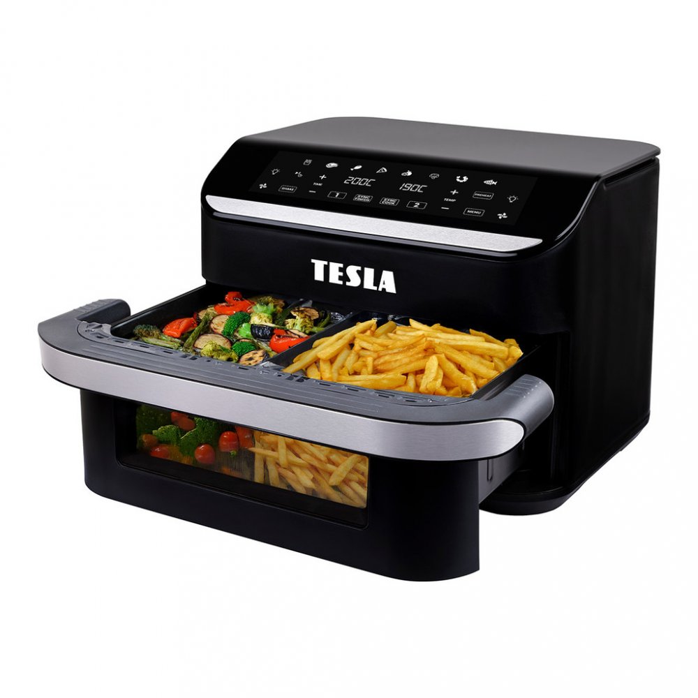 TESLA AirCook FlexiZone Q570 XXL je navržena s ohledem na moderní kuchyně. Kompaktní design nezabere příliš mnoho místa na vaší kuchyňské desce. Je dodávána s osmi automatickými programy a 60minutovým časovačem s automatickým vypnutím.