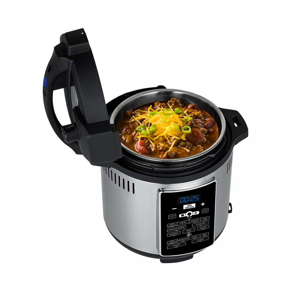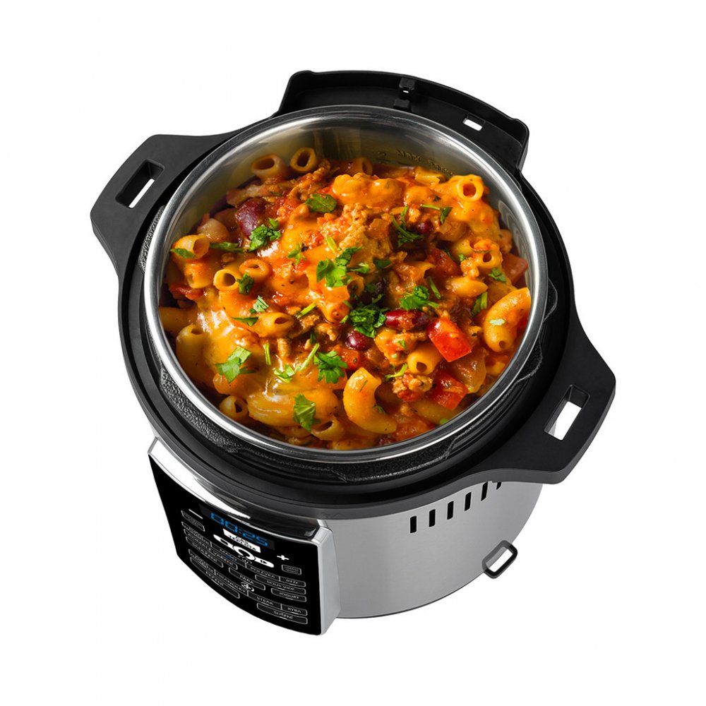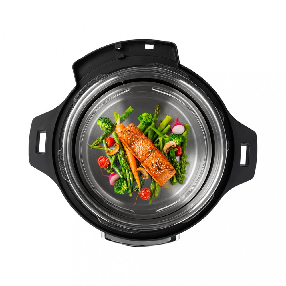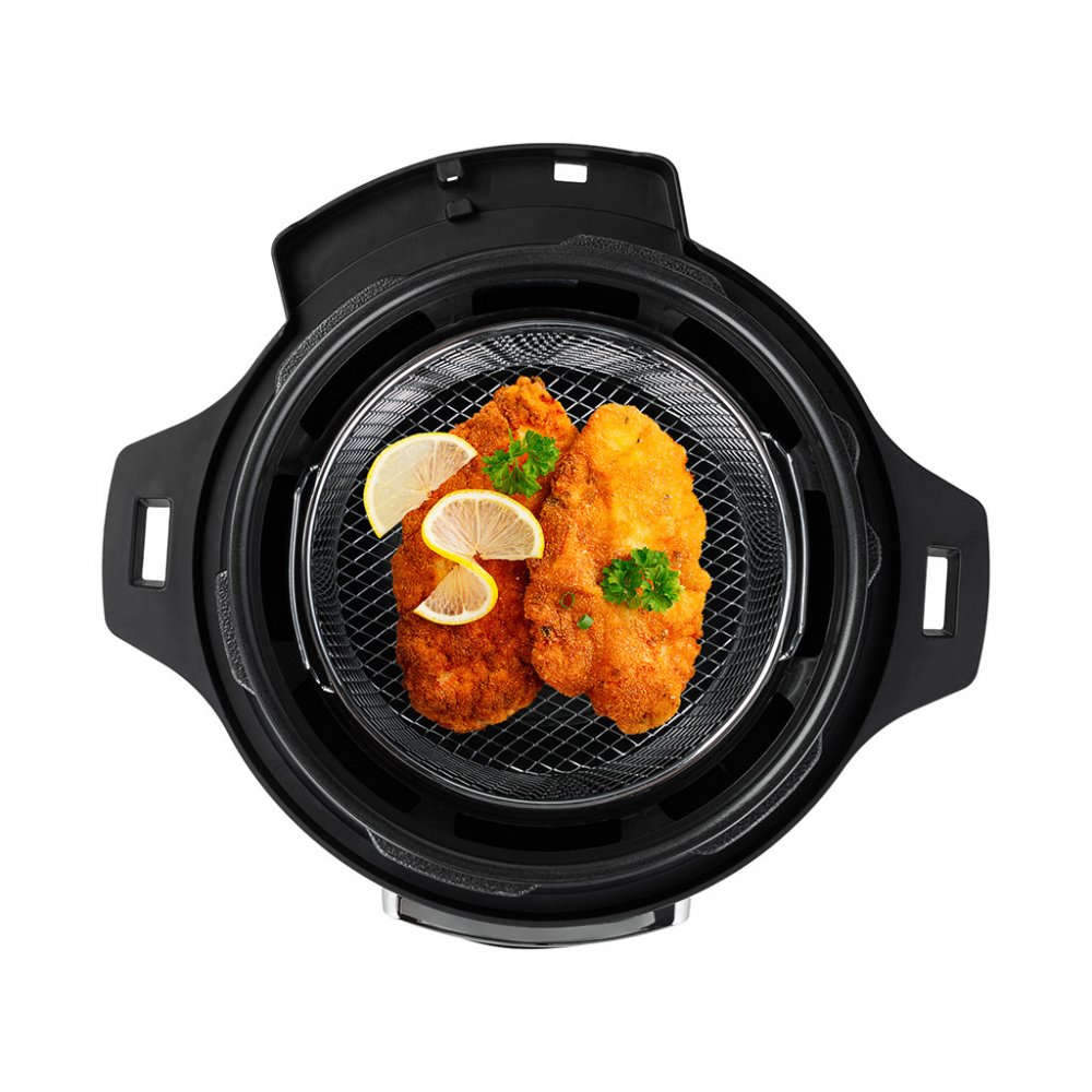 Můžete si tak pochutnat na klasickém vývaru, guláši, hovězí/vepřové pečeni, těstovinách, masových kuličkách, zelí, perkeltu, bramborách, rýži, luštěninách a dalších, podobně jako v klasickém tlakovém hrnci. Navíc také získáte možnost upéct horkým vzduchem křupavé kuře, hranolky, steak nebo rybu.