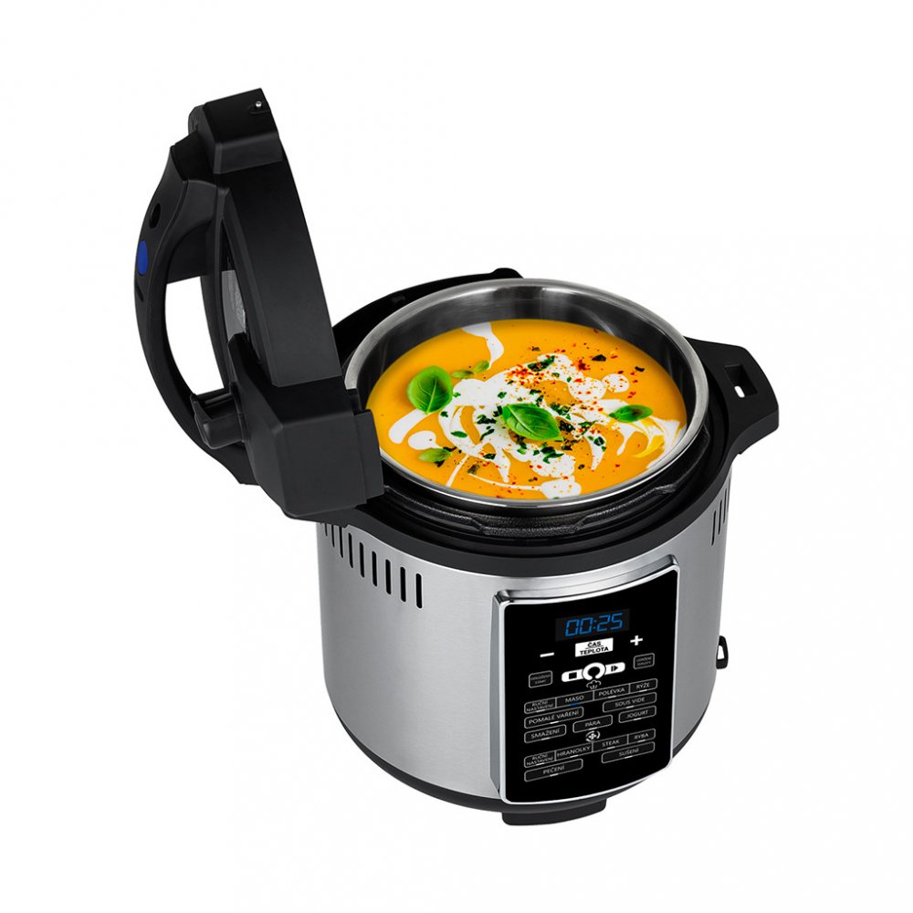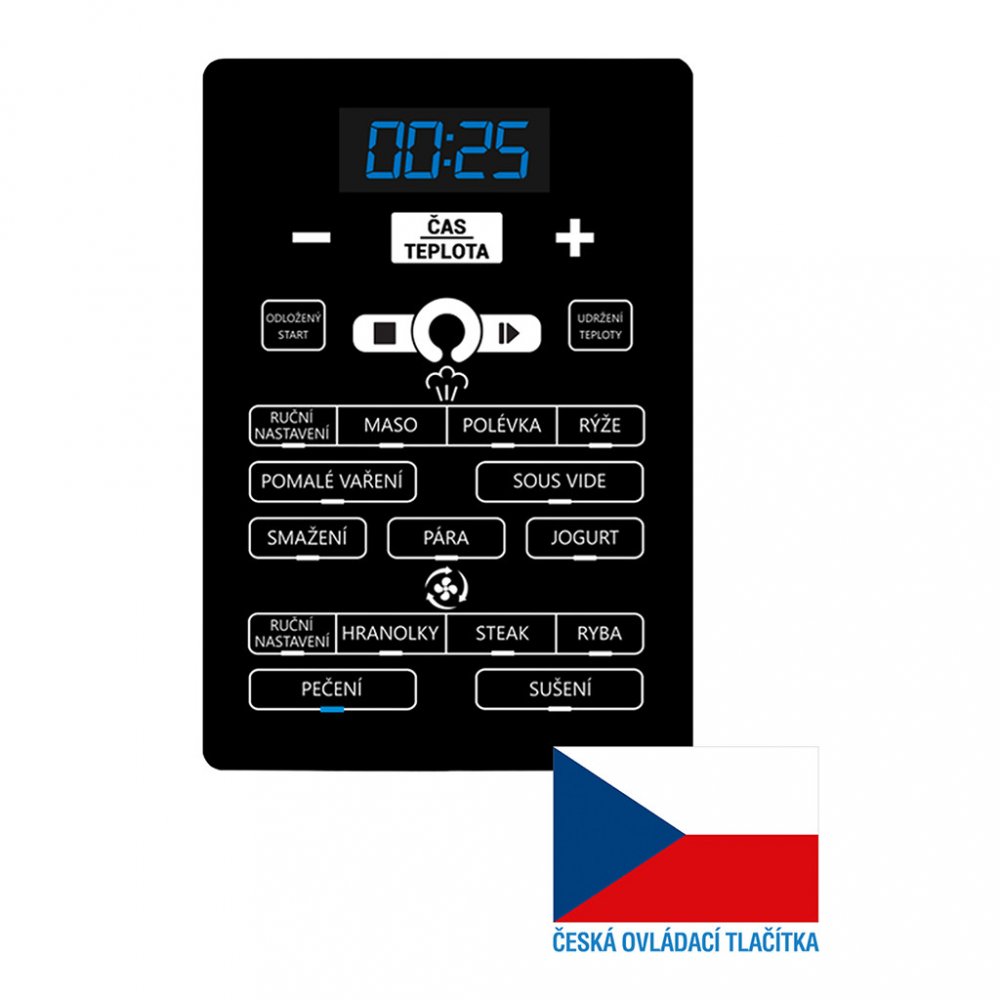 Přehledný digitální displej s modrým podsvícením a tlačítka v češtině vám usnadní rychlé nastavení programu pro vaření. Zvolený program automaticky udržuje správnou teplotu během vaření, reguluje tlak a displej zobrazuje zbývající dobu vaření. Po dokončení programu je jídlo udržováno teplé, vhodné k servírování na stůl.