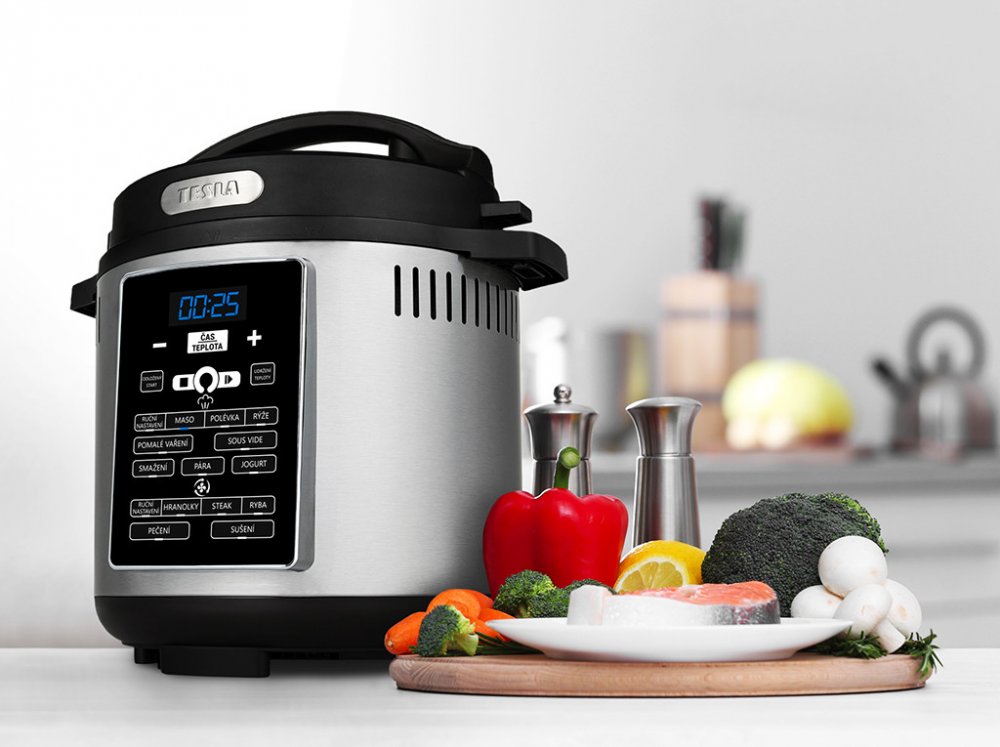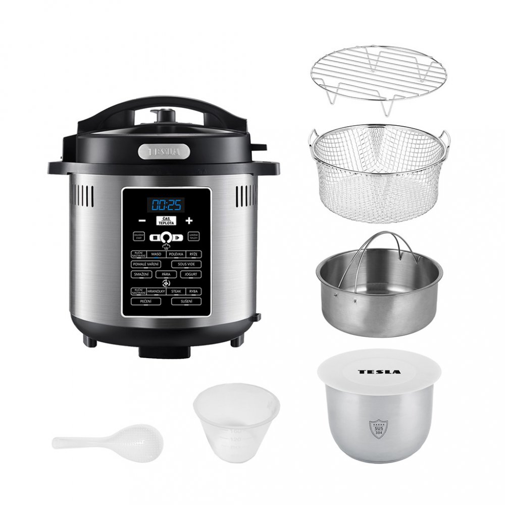 Multifunkční elektrický tlakový hrnec TESLA EliteCook K80 Deluxe je tlakový hrnec, horkovzdušná fritéza, pomalý hrnec, Sous vide, rýžovar, jogurtovač, napařovací hrnec, pánev na smažení nebo restování, vařič vajíček, ohřívač jídla, sušička jídla, sterilizátor. Uvaří také současně hlavní jídlo i přílohu.