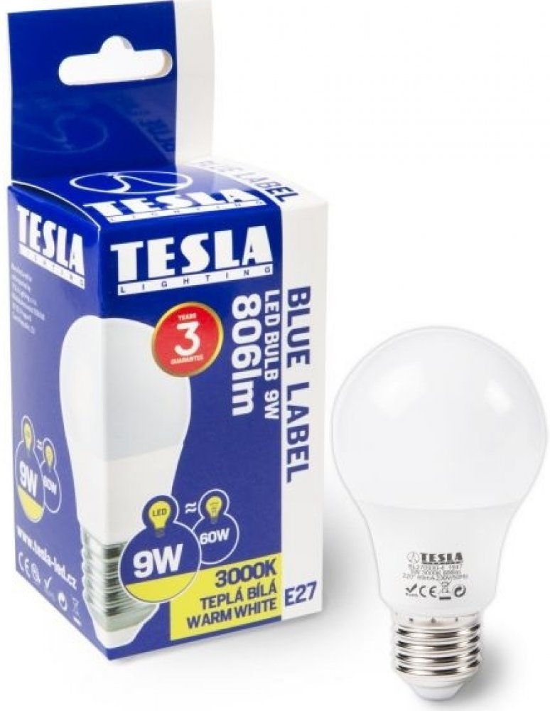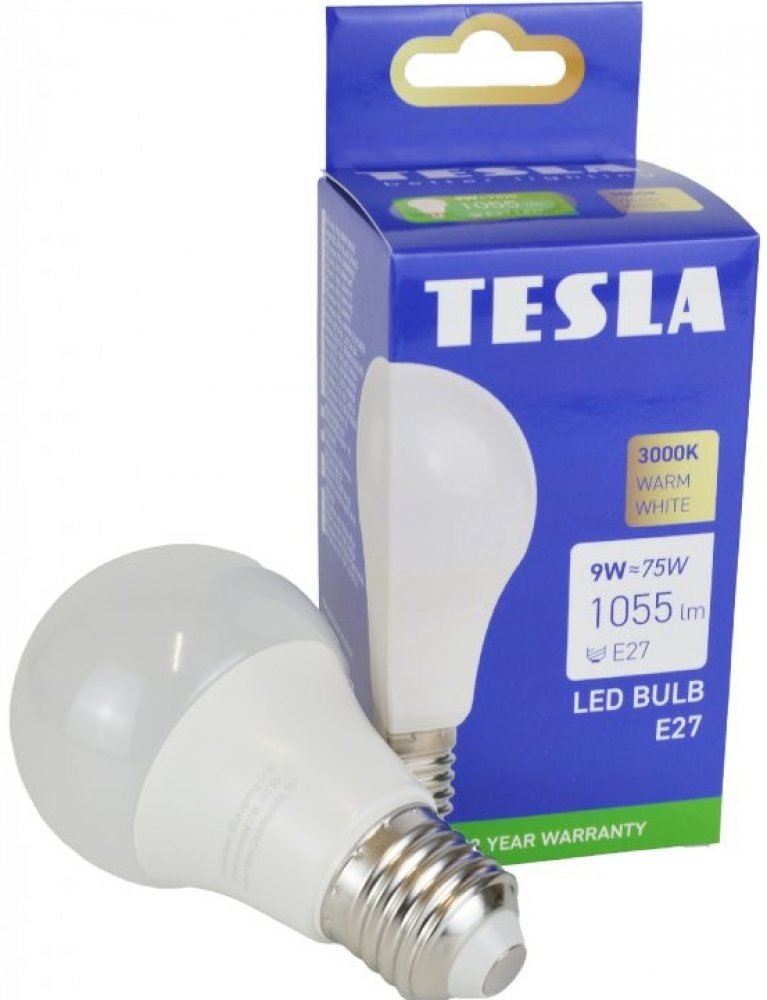 Tesla LED žárovka BULB E27, 9W, 230V, 1055lm, 25 000h, 3000K teplá bílá, 220st