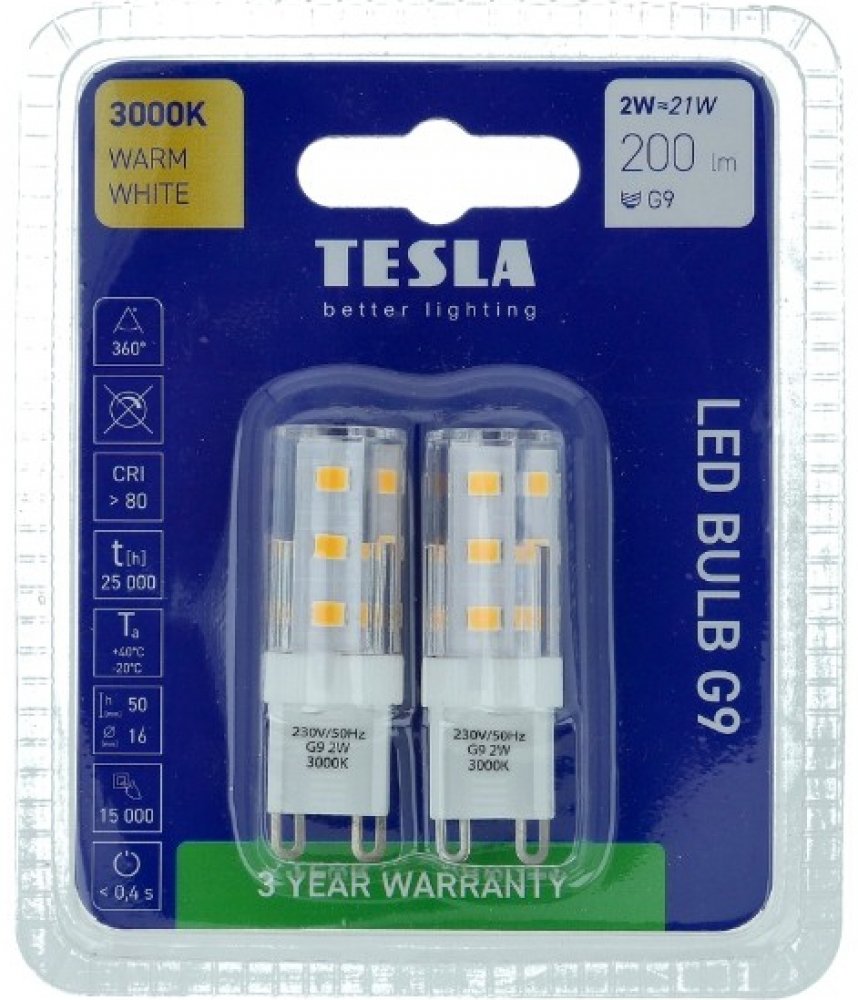 LED žárovka od tradiční české společnosti s více než 100letou historií TESLA lighting. Tato žárovka je určena pro svítidla s paticí G9. Vyzařuje teplé bílé světlo s chromatičností 3000K a svítivostí 200 lm, které je ideální na relaxaci a odpočinek, proto lze tuto žárovku doporučit zejména do dětských pokojů, obývacích pokojů a ložnic. Díky moderní a efektivní LED technologii nahradí s příkonem 2 W klasickou 20W žárovku a ušetří Vám až 85 % nákladů na energii. Jistě také potěší dlouhá životnost až 25 000 hodin a 15 000 spínacích cyklů. Kvalita produktu je podpořena rozšířenou zárukou na 3 roky.