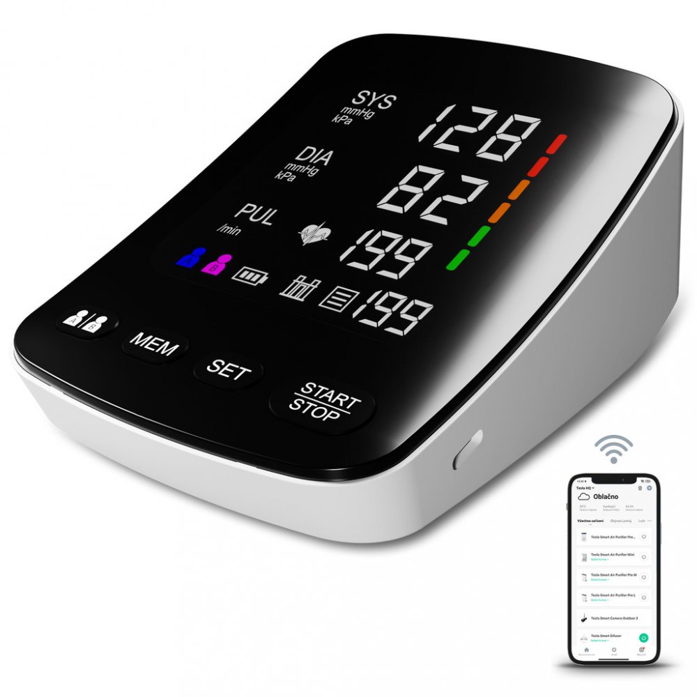 Tesla Smart Blood Pressure Monitor měří systolický a diastolický tlak a puls pomocí akurátní oscilometrické metody. Naměřené hodnoty jsou snadno čitelné na velkém kvalitním LED displeji.