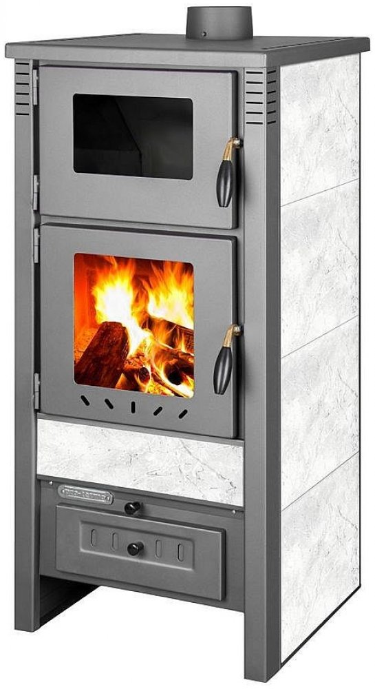 Kamna Pro TAURUS Ceramic s troubouKamna na dřevo a dřevěné brikety určená na vytápění s troubou a nerezovým plechem.Upozornění: Při používání je třeba kamna umístit do bezpečné vzdálenosti od hořlavých materiálů! Tento výrobek není vhodný jako hlavní topný systém. Vlastnosti kamenKamna slouží k vytápění.Mají jednoduchou obsluhu a úsporný provoz.Jejich součástí je i pečicí trouba (nerez-plech).Ohniště: šamot. Rošt: posuvný a vyrobený z litiny.Pro koho jsou kamna vhodná?Kamna se hodí pro vytápění větších prostor, až do 80 m3. Hodí se jak do domu, tak na chatu či chalupu. Využijete je také na pečení díky troubě a nerezovému plechu.Doplňující technické informacePrůměr kouřovodu: 120 mmMateriál: šamot, plech, nerez, keramikaKouřovod: horníVzdálenost od hořlavých materiálů: Zezadu: 40 cm, Ze stran: 40 cm, Ze předu: 80 cmPřípustná paliva: dřevo/ dřevěné briketyTeplota spalin: 279,8 °CEnergetická výkonnost: 76,04%Výkon: 12 kWRozměr topeniště: 310 x 350 x 425 mmRozměr pečicí trouby: 325 x 390 x 195 mmEnergetická třída: ATopný prostor: 60 - 80 m2Rozměr kamen: 520 x 460 x 1020 mm