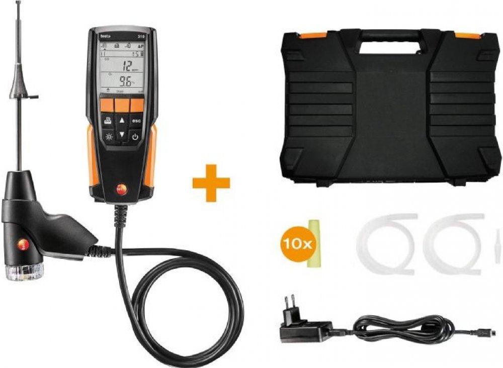 Testo 310, sestava analyzátoru spalin, vč. sondy 180 mm s kónusem silikonové hadičky pro měření tlaku ,filtry nečistot 5ks, náhradní tlakové zátky 5ks,síťový zdroj