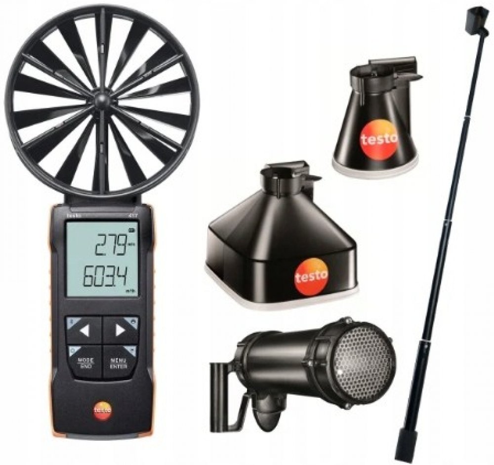 Testo 417 - Digitální větrný anemometr se sondou pr. 100 mm, spolupracující s aplikací Kompaktní větrný anemometr testo 417 byl vyvinut tak, aby maximálně usnadnil provádění měření na vstupech a výstupech vzduchu v klimatizačních a ventilačních systémech. Integrovaná větrná sonda o průměru 100 mm pro přesné výsledky. Průměrné hodnoty v čase a v bodě, stejně jako objemový průtok jsou automaticky vypočteny přístrojem a zobrazeny na displeji. To umožňuje obzvláště efektivní regulaci udržitelných ventilačních systémů v obytných budovách – včetně rychlé dokumentace pomocí aplikace testo Smart App. Kromě toho aplikace nejen podporuje uživatele v konfiguraci měřicího zařízení a přebírá zobrazení, ukládání a dokumentaci naměřených hodnot - také změní smartphone na druhý displej. Anemometr testo 417 je k dispozici také ve dvou praktických sadách: testo 417 sada 1 obsahuje dva rukávy pro měření na anemostatech a větracích mřížkách. Lze je snadno připevnit na sondu zakrytím