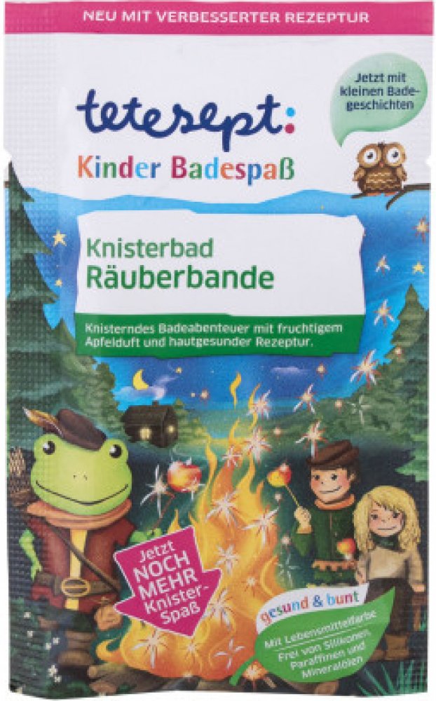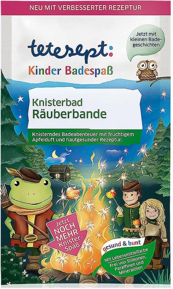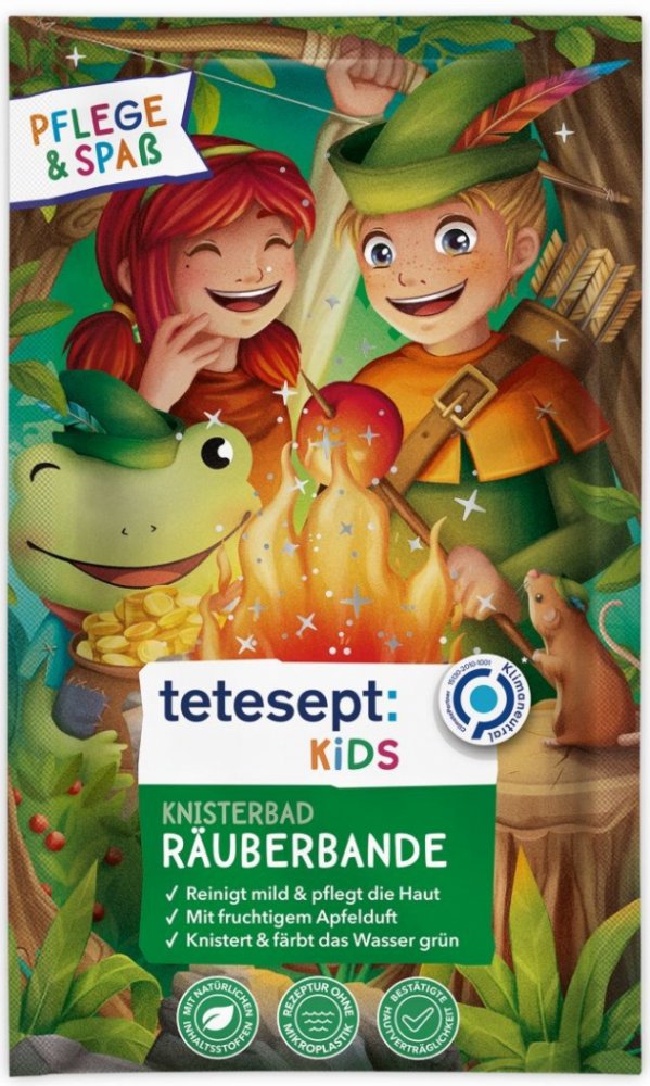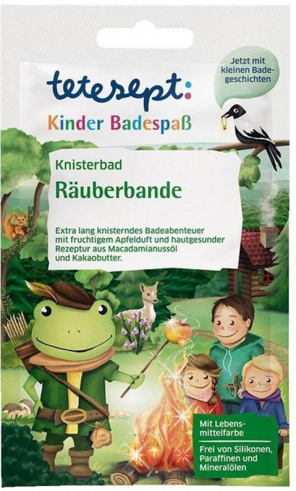 Zažijte se svými dětmi během koupání to pravé dobrodružství s praskající koupelí **Tetesept Children's Bathing Fun Crackling Bath Robber Gang**! ### Pečující a zábavná koupel Tetesept nesmí chybět v žádné koupelně! * **jemně čistí a vyživuje pokožku**, * **ovocná jablečná vůně**, * **obarvuje vodu na zeleno**, * **vytváří dlouhotrvající praskací efekt**, * nezanechává skvrny na pokožce, vlasech ani