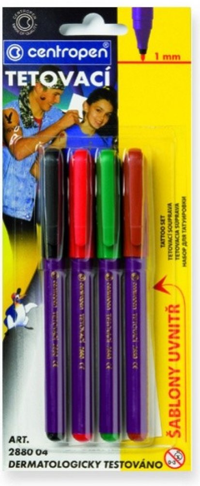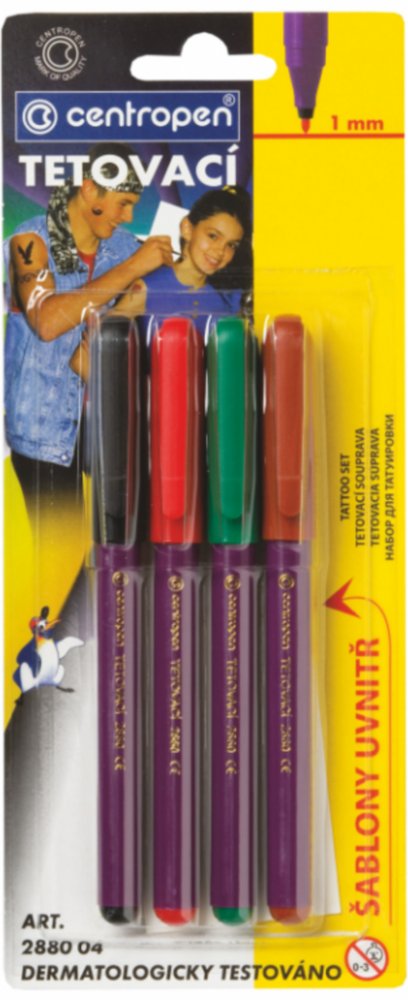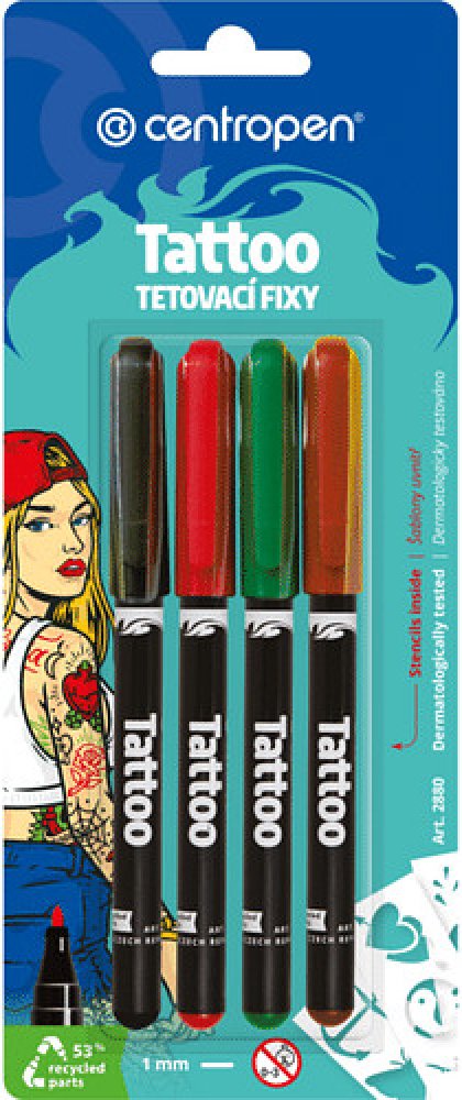 Sada tetovacích fixů na kůži. Nový, bezbolestný a snadný způsob tetování pro děti a mládež. Sada obsahuje samolepicí šablony s 16 motivy, které se dají opakovaně použít a 4 různobarevné popisovače naplněné tetovacími inkousty. Tetování vydrží až 60 hodin, z kůže je možné jej odstranit mýdlem a vodou. Vypratelné z většiny textilií. Inkoust byl přísně dermatologicky testován. Není však vhodný pro ko...