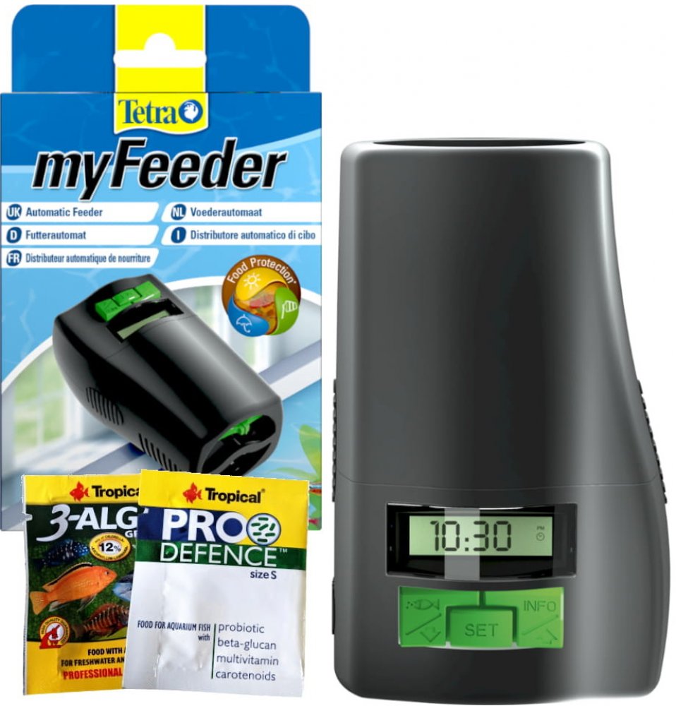 Krmítko jsem koupil abych zabezpečil možnost krmení v době kdy nebudu doma . Nastavení dle návodu jednoduché. Krmíme vločkami Tetra min . Před naplněním jsem je maličko promnul. Montáž na akvárium jednoduchá. Mohu jen doporučit.