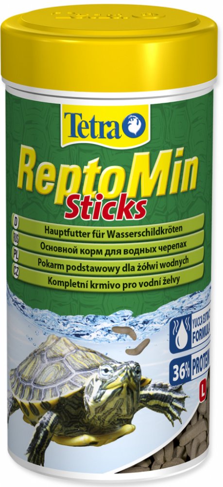Jakostní znaky: proteiny 39%, vlhkost 9%, tuky 4,5%, hrubé popeloviny 15%, vláknina 2%, vápník 3,3%, vitamín A 29500 m.j./ kg, vitamín D3 1845 m.j./ kg, vitamín E (alfatokoferol) 100 mg / kg, L-askorbyl-2-polyfosforečnan (stabilizovaný vitamín C) 264 mg / kg. Plovoucí tyčinky pro vodní želvy.