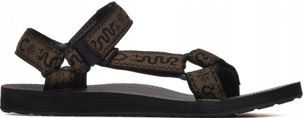 '.Univerzální pánský sandál s otevřenou špičkou. Doporučujeme pro lehčí turistiku, festivaly, k vodě i do města. Lze používat ve sladké a slané vodě. Černá podešev, olivově zeleno-hnědé pásky s černým vzorem.- pásky z příze Unifi's REPREVE - polyesterová příze vyrobená z recyklovaného plastu (dohledatelný a ověřitelný původ) - použita k výrobě recyklovaných polyesterových pásků na sandálech Teva.-...