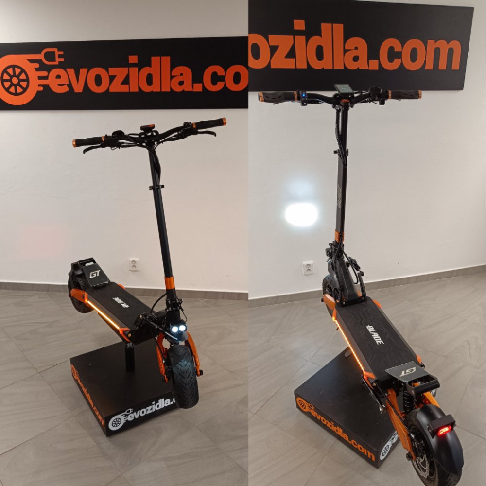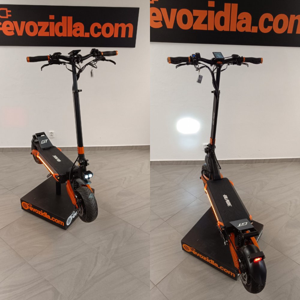 Blade GT+ II je nezmar. Má dva silné elektromotory s nominálním výkonem 2x 1 600 W. Ve špičce však dokáže vytáhnout až 5 000 W. Díky nim z koloběžky vymáčknete rychlost až 85 km/h. Tahle varianta je vybavena plně nastavitelnými hydraulickými tlumiči, takže se perfektně hodí na všechny druhy povrchů. A tomu odpovídá i obutí. Na kolech jsou totiž speciální 11“ pneumatiky s vnitřní povrchovou úpravou proti defektům.