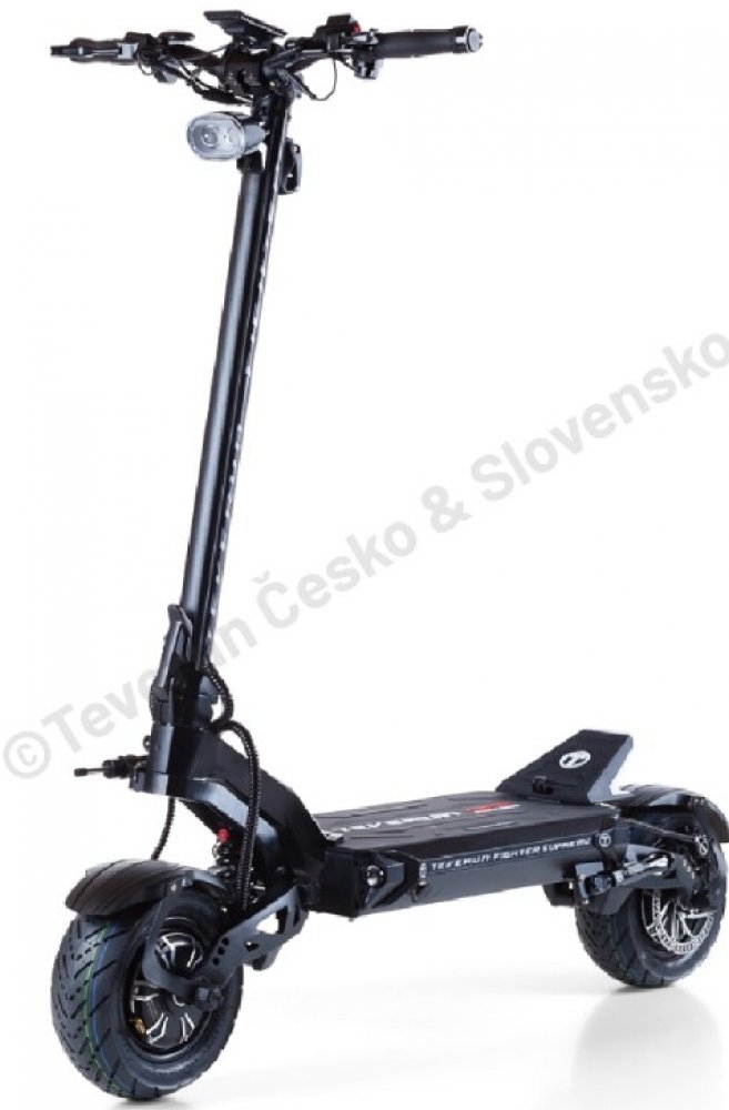 Parametry Teverun Fighter Supreme Ultra 72 V, 60 Ah Blade SK, 2x 2500 W (8 000 W) Výkon 2x2500 W špičkový 8 000 W Váha 59 kg Dojezd až 200 km Baterie Li-ion 60 Ah Samsung 72V 4800 Wh Max. rychlost 25 km/h- po odblokování 100 km/h Brzdy Hydraulické kotoučové Nosnost 150 kg Pneumatiky 90/65-6,5 11" bezdušové pneu Nový Supreme Ultra s 4" TFT displejem a baterií SK Blade