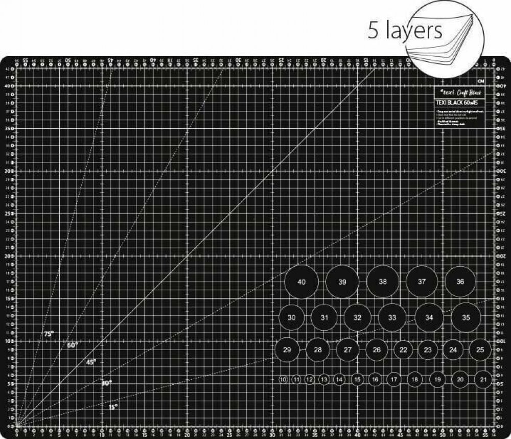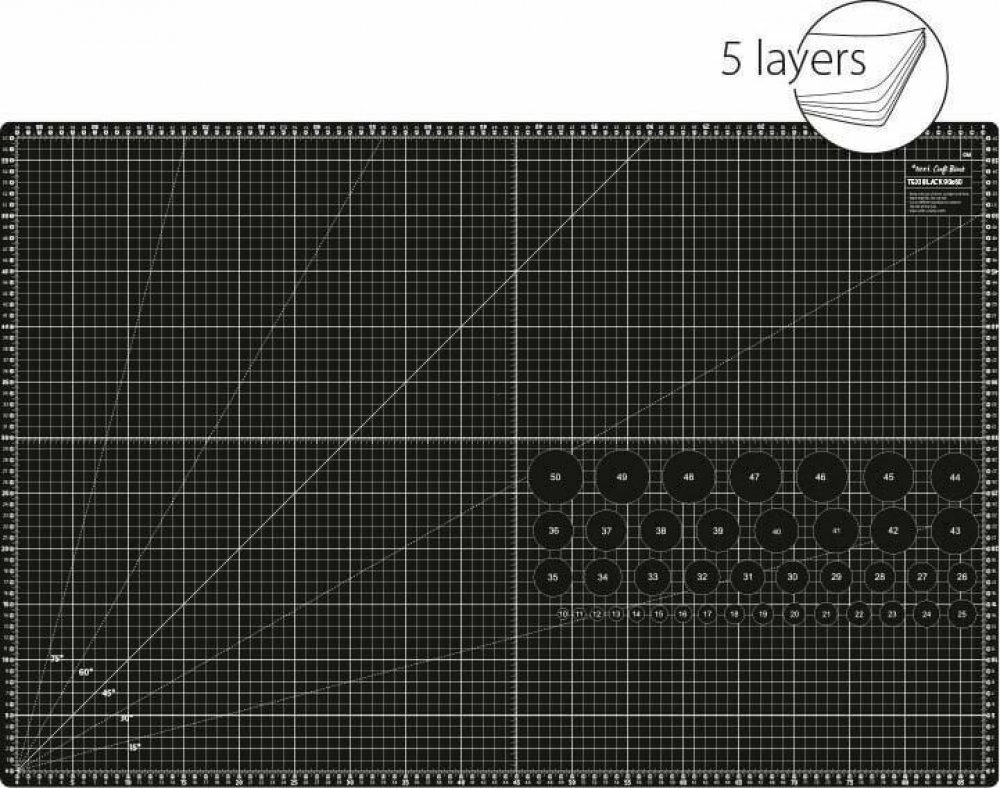 5-vrstvá řezací podložka. Kompaktní jednostranná řezací podložka určená pro přesné řezání látek pomocí řezacího kolečka nebo skalpelu. Díky 5vrstvé zesílené konstrukci a tloušťce 3 mm je vhodná i na hrubší materiály, kde je třeba vyvíjet větší tlak. Podložka má samosvorný povrch, který se po řezu uzavře, čímž prodlužuje životnost řezného nástroje. Obsahuje měřící síť v cm i palcích, s úhly a rovno...