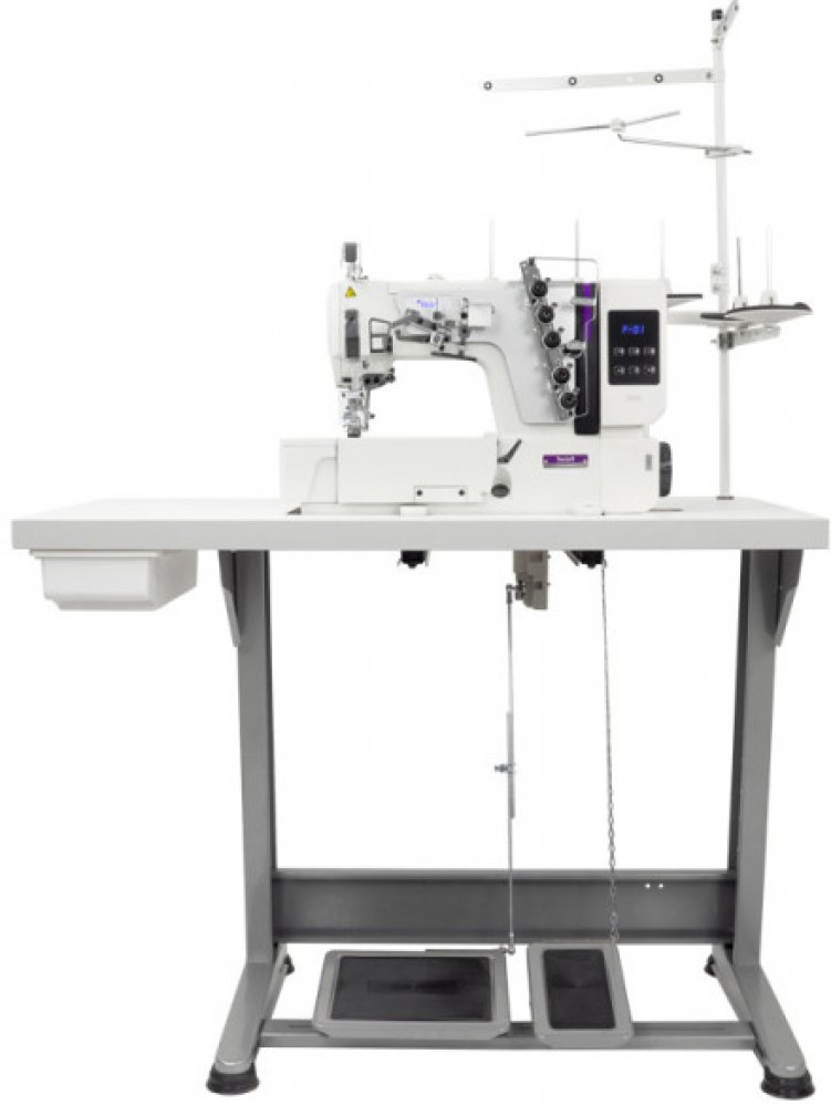 3jehlový, 5nitný interlock s plochým ramenem pro šití lehkých a středních materiálů. Vybavený diferenciálním spodním podáváním a automatickým polohováním jehly.