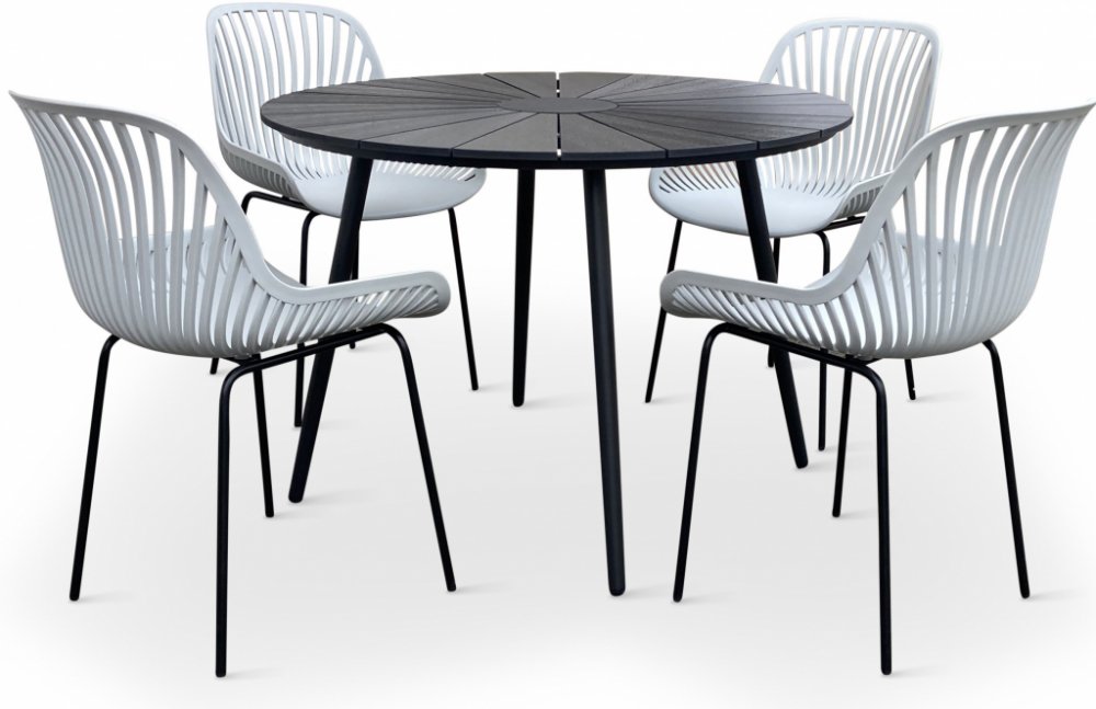 Moderní sestava nábytku na zahradu s kovovou konstrukcí pro 4 osoby. Sestavu tvoří Zahradní kulatý stůl WILDER 105cm a 4x Designová židle GABY šedá.