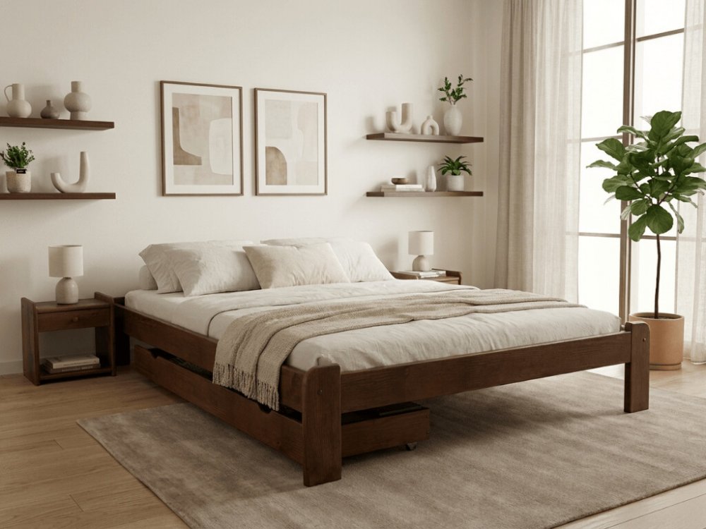 Postel má nosnost 120 kg na osobu, což znamená celkovou nosnost 240 kg. Robustní konstrukce z masivního borovicového dřeva zajišťuje stabilitu a dlouhou životnost. Tip: Pravidelně kontrolujte šrouby, abyste udrželi pevnost konstrukce.
