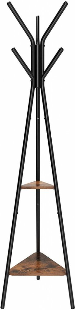Stylový stojanový věšák v loft designu s kombinací kovu a dřeva se hodí do předsíně, šatny, obýváku i chodby. Nabízí 6 zaoblených háčků na kabáty a doplňky, 2 praktické police a stabilní trojnohý podstavec. Pevná železná konstrukce a odolné MDF zajistí dlouhou životnost, zatímco bezpečnostní nožky chrání podlahu.