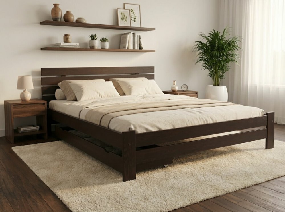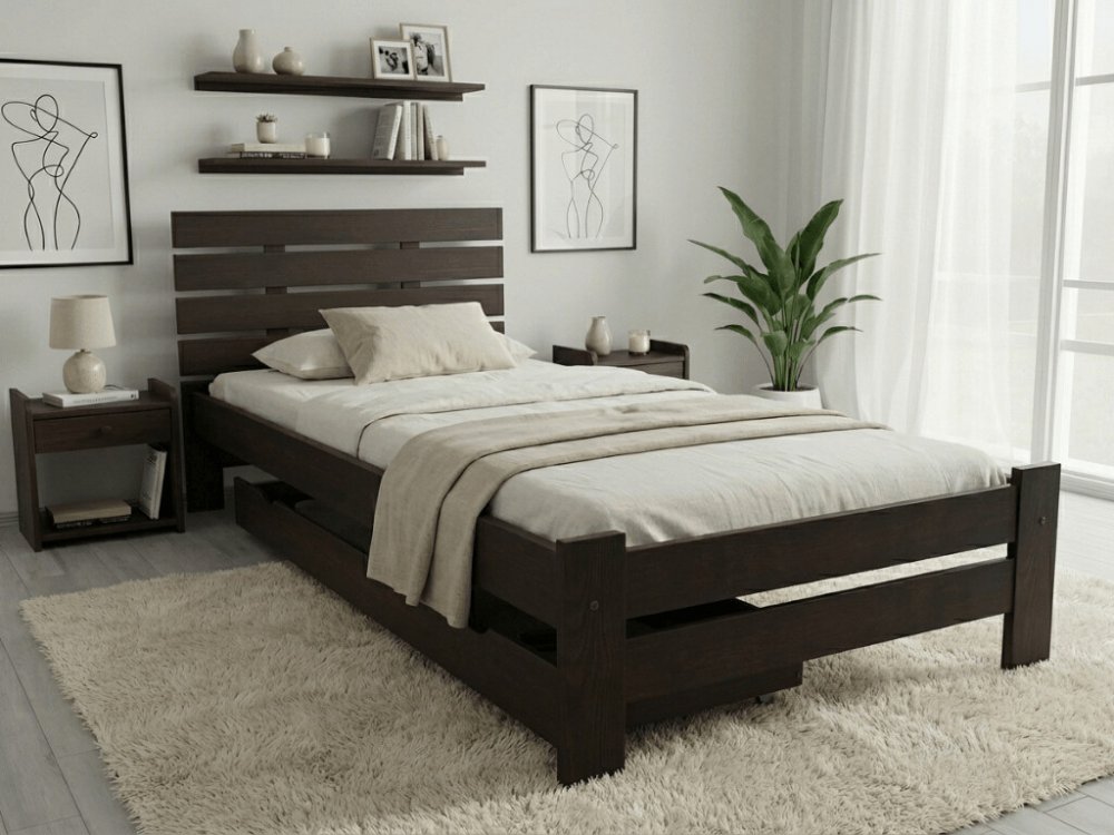 Pro milovníky tmavších odstínů je ideální dekor ořechu. Postele v ořechové barvě připomínají barvu hořké čokolády. V interiéru ložnice působí dominantně a vkusně. Moderně působí kontrast světlého interiéru v krémových nebo bílých odstínech s postelí v přírodní barvě ořechu.