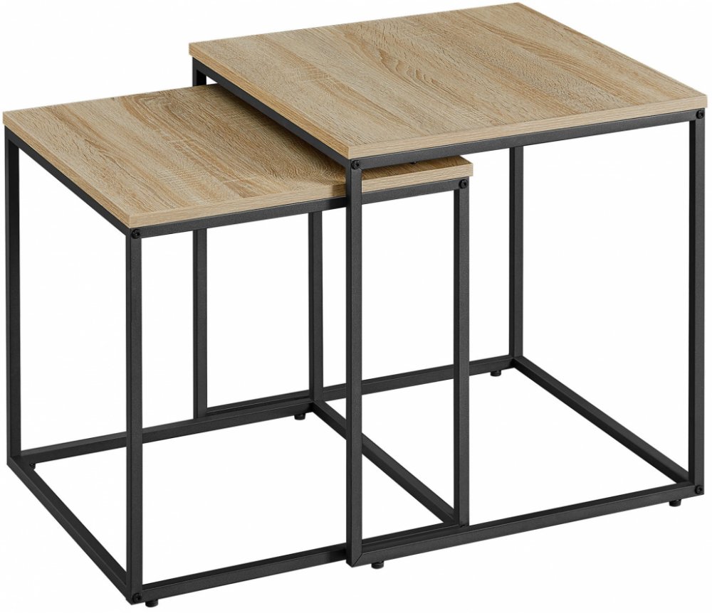 Tato sada dvou stolků přináší skvělou kombinaci stylu a praktičnosti, kterou oceníte v každé domácnosti. Menší stolek snadno zasunete pod větší, což je ideální řešení pro úsporu místa v menších místnostech. V obývacím pokoji mohou sloužit jako konferenční stolky, kde menší stolek použijete k odložení nápojů nebo ovladačů, zatímco větší poskytne prostor pro dekorace nebo knihy. V ložnici je lze využít jako noční stolky s dostatkem místa pro lampičku, knihu a další nezbytnosti. Díky jejich jednoduchému, ale elegantnímu designu v dekoru dub sonoma a černé oceli je snadno sladíte s jakýmkoli interiérem. Navíc můžete jejich vzhled oživit pomocí doplňků, jako jsou vázy, svíčky nebo organizéry na drobnosti. S těmito stolky si vytvoříte nejen funkční prostor, ale i útulný koutek, který bude lákat k odpočinku a pohodě.