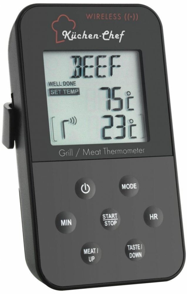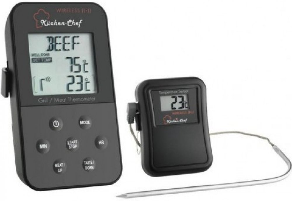 Dálkově ovládaný teploměr určený pro kontrolu teploty masa a drůběže při přípravě. Pomocí vpichového čidla teploměr zjistí aktuální teplotu uvnitř masa a tu bezdrátově přenáší do hlavní jednotky, kterou můžete mít umístěnou mimo místo pečení (do 40m). Přístroj dispnouje teplotním alarmem. Také si lze nastavit stopky a časovač.