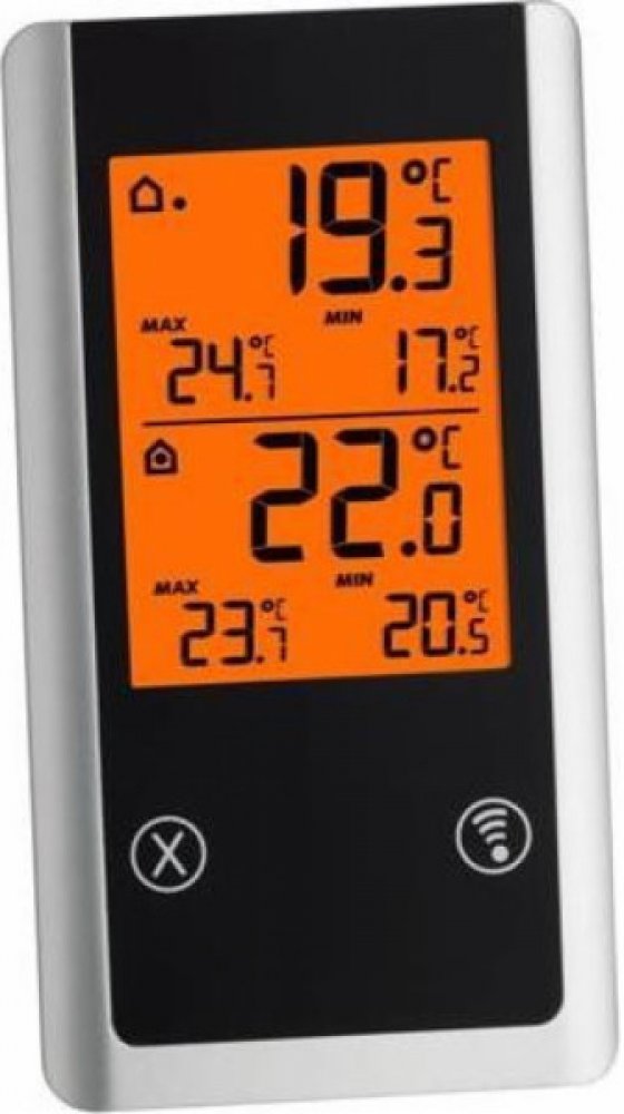 Bezdrátový teploměr TFA 30.3055.01 měří jak vnitřní, tak venkovní teplotu. Jeho výhodou je stálé zobrazení maximálních a minimálních naměřených hodnot teploty. K teploměru je možné připojit pouze jedno venkovní čidlo, které je součástí balení. Ve volném prostoru má čidlo dosah až 100m. Venkovní čidlo i přijímací část teploměru lze zavěsit na stěnu postavit...