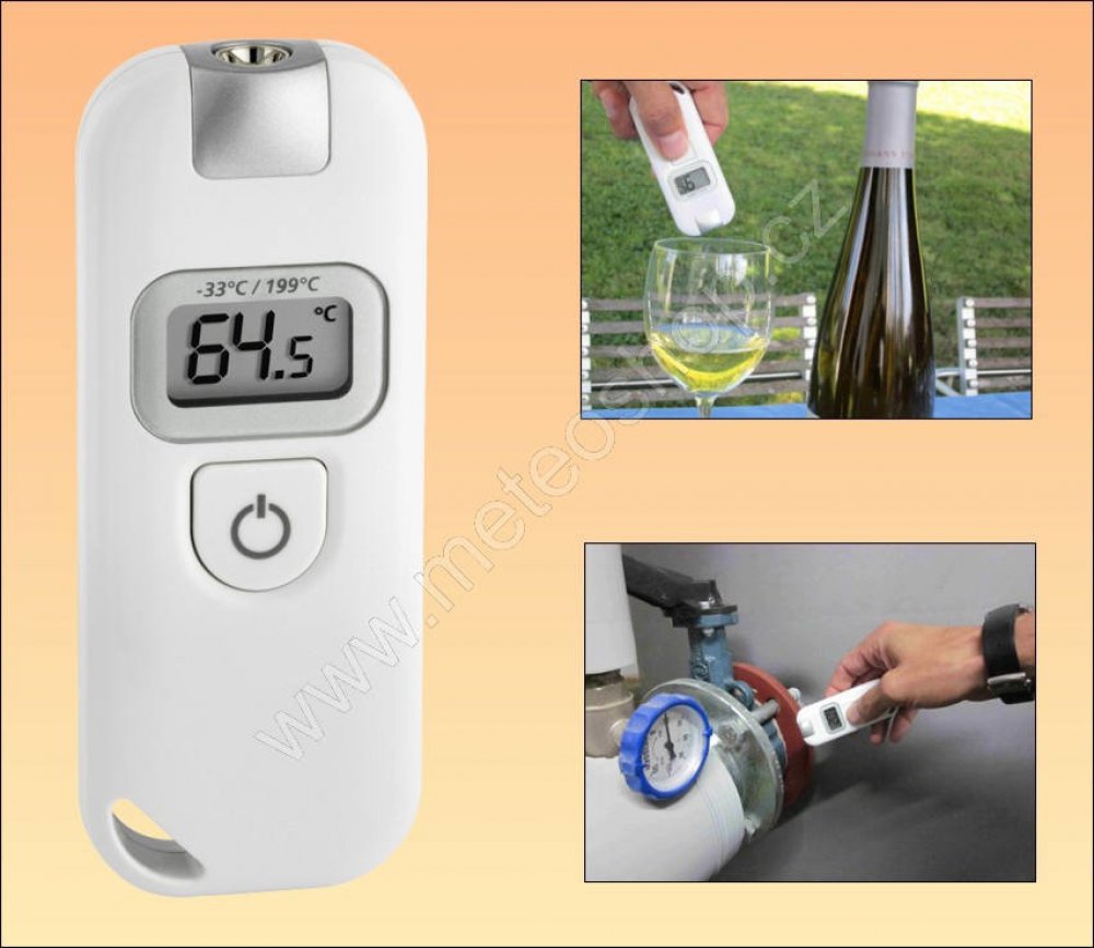 Bezdotykový infra teploměr pro měření povrchové teploty materiálu, kapalin. Není možné měřit teplotu skrze průsvitné materiály (sklo, plast) a teplotu ovzduší. V prašném prostředí, kouři či páře může dojít k chybě měření. Rychlá reakční doba 1 sekunda je vhodná k měření teploty potravin, ale využití najde i ve stavebnictví a různých opravnách. Je vyrobený z plastu, ve tvaru tužky. Má dobře čitelný...