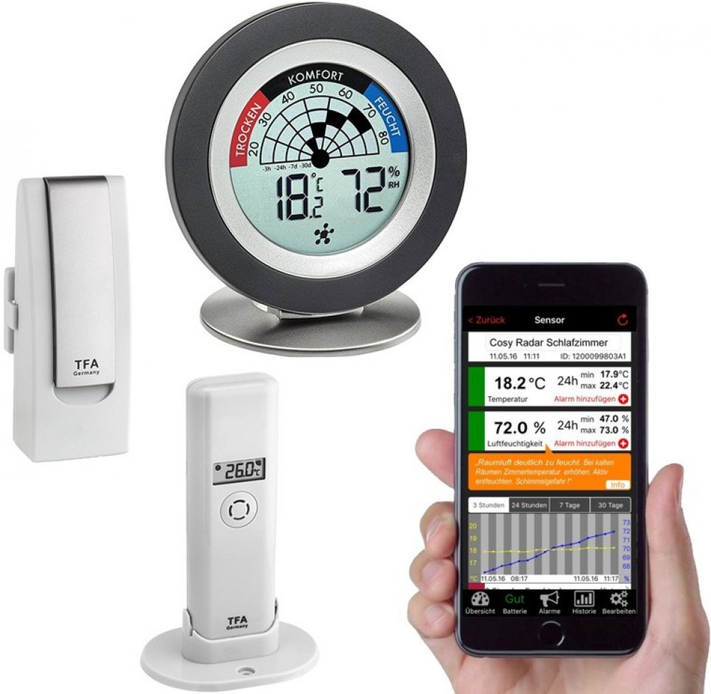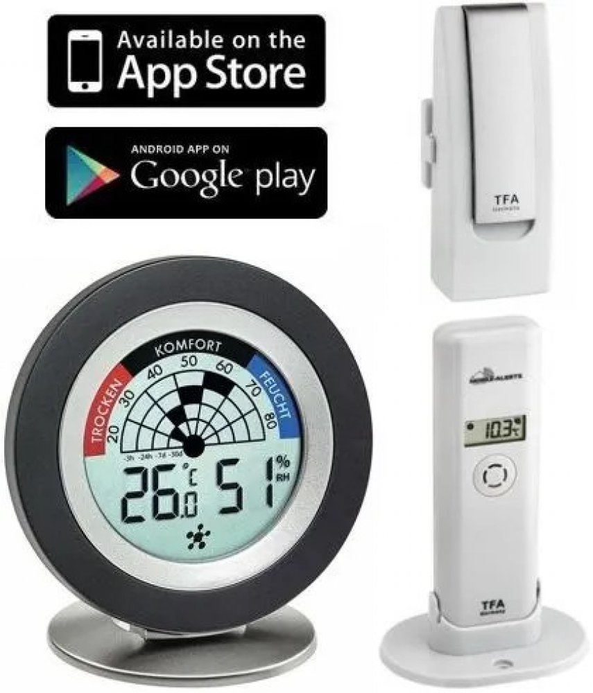 TFA 31.4008.02 WEATHERHUB – set č. 8 – brána, vnitřní teploměr/vlhkoměr, čidlo teploty a vlhkosti – perfektní sada pro ty, kteří chtějí žít zdravě a hlídat si doma ideální klima, tj. správnou teplotu a vlhkosti, prevence proti plísním a suchému ovzduší, aplikace dává tipy kdy větrat atd.