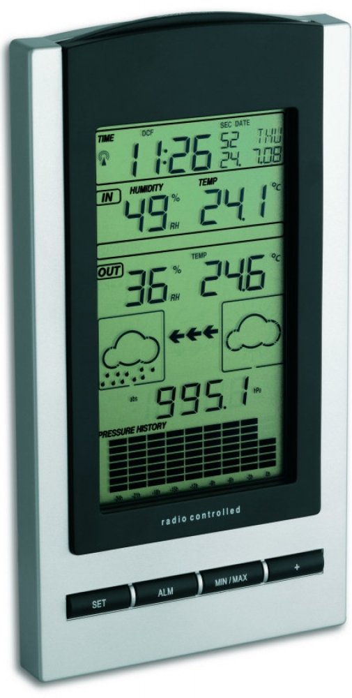 Na displeji je též zobrazen čas a datum řízený DCF signálem, historie atmosférického tlaku (až 24 hod.) a samozřejmě symbolová předpověď počasí s
