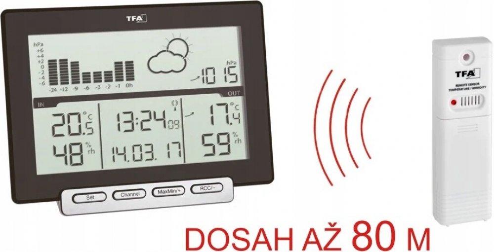 Digitální meteostanice, bezdrátový přenos z čidla (součástí balení) na max. vzdálenost 80 m, zobrazuje vnitřní teplotu/vlhkost a venkovní teplotu/vlhkost, hodnotu tlaku, tlakovou tendenci, graficky historii vývoje tlaku za 24 hodin, čas, datum