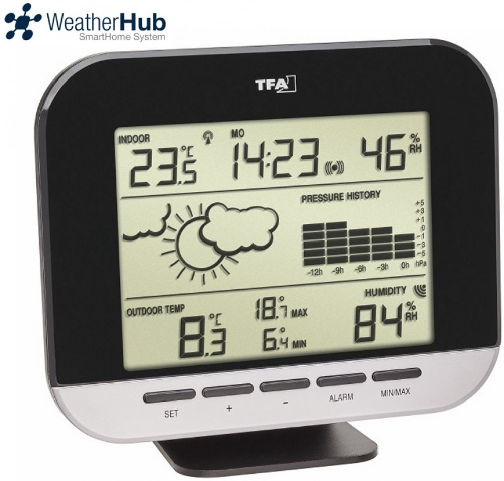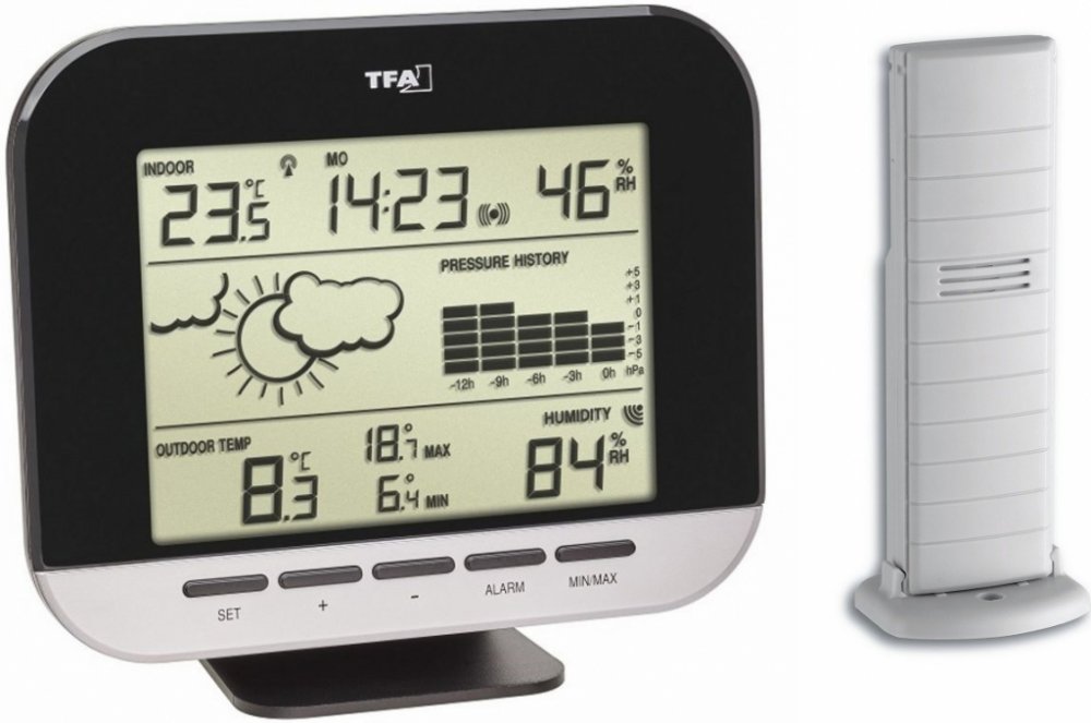 Integrovaný elektronický barometr měří tlak vzduchu; průběh za posledních 12 hodin lze sledovat na sloupcovém grafu. Slunce, zamračeno nebo deště - na základě změn tlaku vzduchu vysílá symboly počasí je výhledu na o nastávajícím počasí.