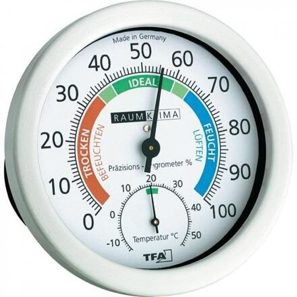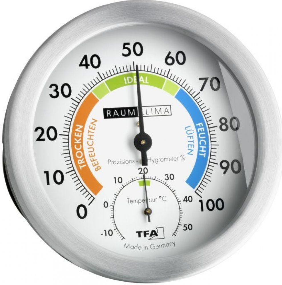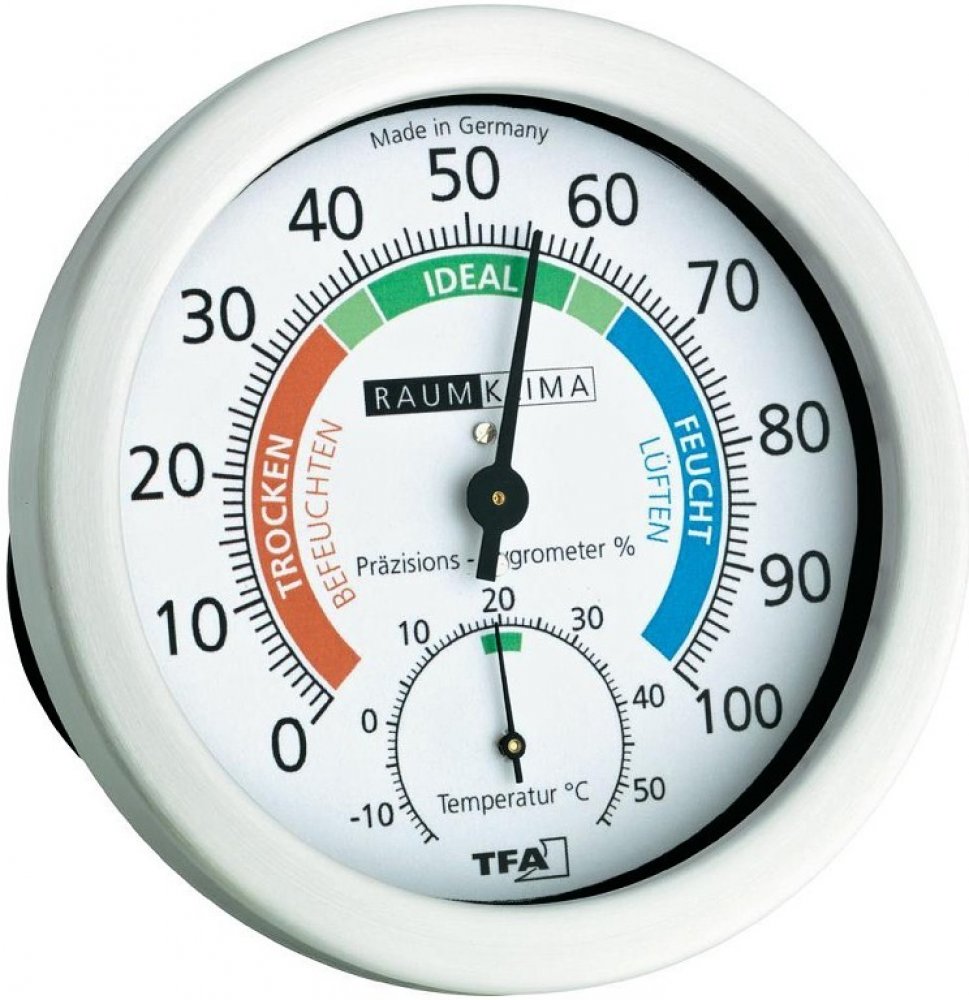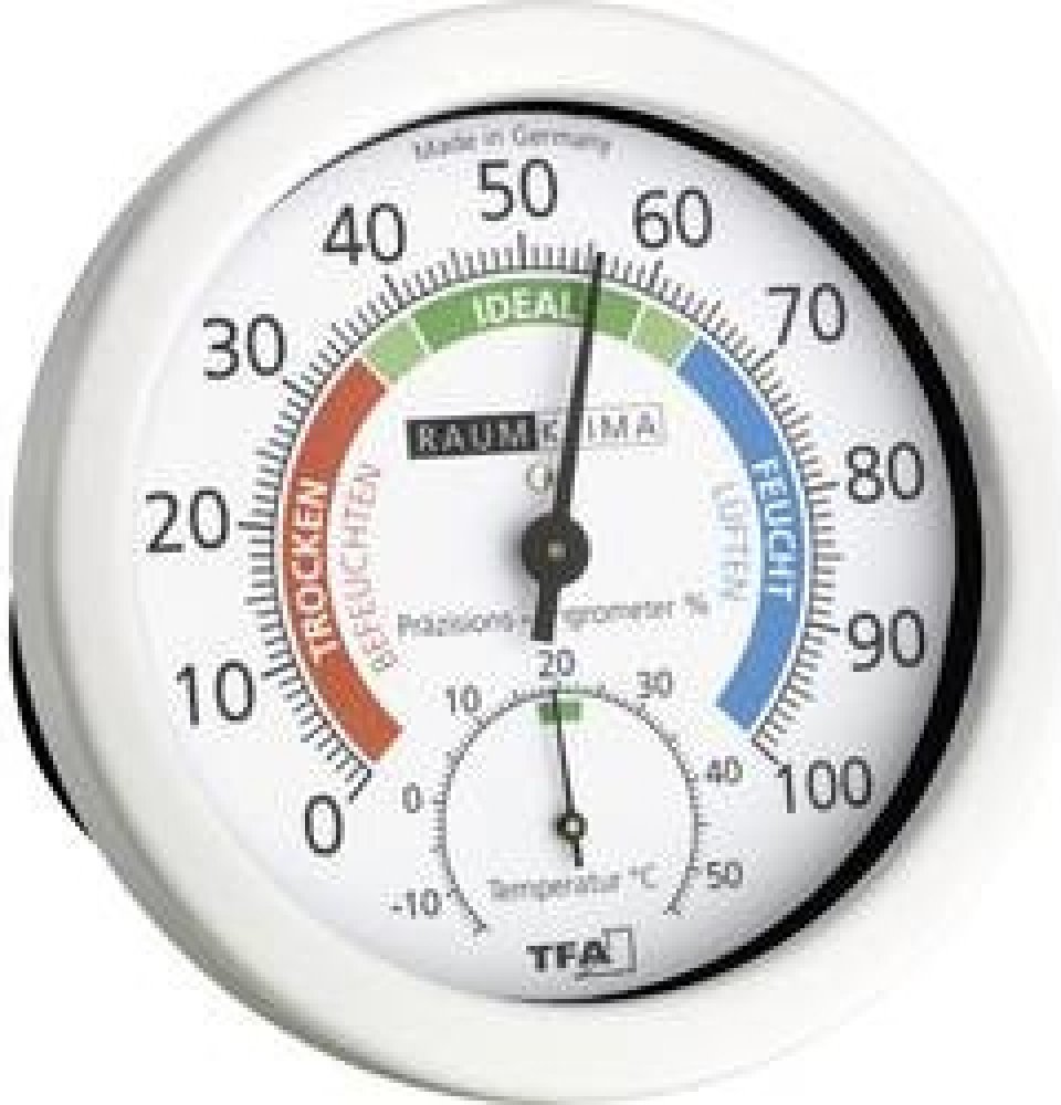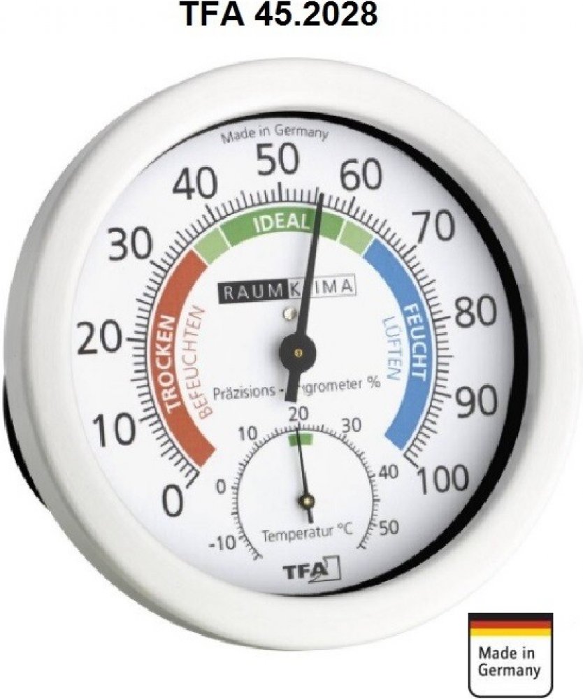 Tato kombinace vlhkoměru a teploměru je ideální pro obytné či pracovní prostory, neboť na své stupnici rozlišuje ideální klima od podmínek, jenž nejsou vhodné pro lidské zdraví. Vnitřní teploměr a vlhkoměr TFA 45.2028 lze zavěsit nebo postavit na podložku. Jedná se o vlhkoměr s umělým vlasem.
