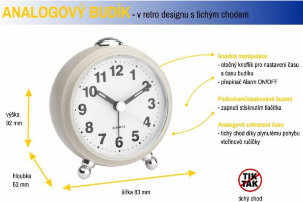 Retro vzhled, analogové zobrazení, tichý chod, možnost nastavení opakovaného buzení (SNOOZE), podsvícení, barva béžová.