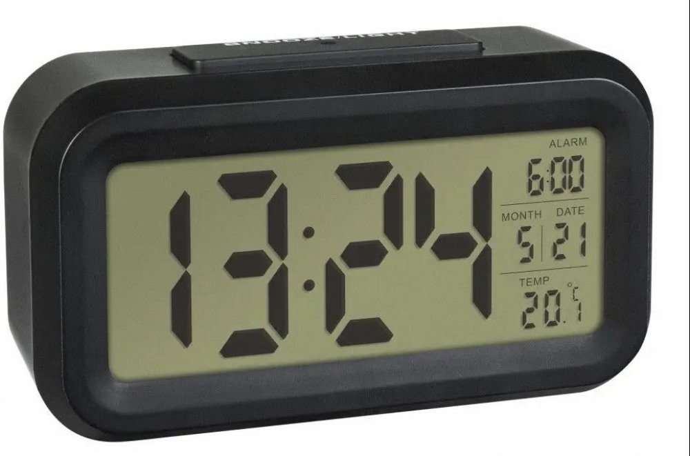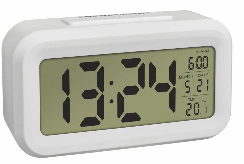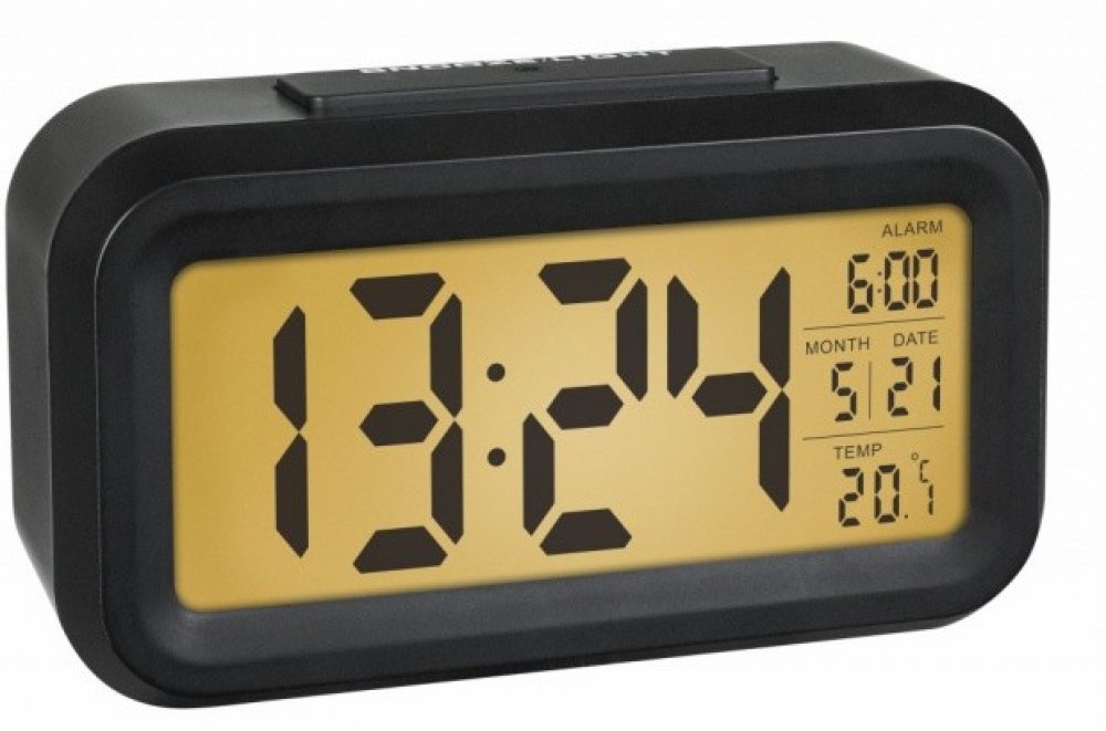 Digitální budík s velkou LCD obrazovkou a s funkcí zobrazení data a vnitřní teploty.