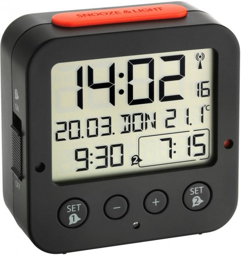 Představujeme Vám nový digitální budík s možností dvou samostatných budících časů s různými zvuky a hodinami řízenými DCF signálem. Co však uživatelé na tomto budíku nejvíce ocení jsou praktická tlačítka s možností vypnutí/zapnutí zvuku při jejich stlačení a světelný senzor pro automatické podsvícení displeje za horších světelných podmínek.